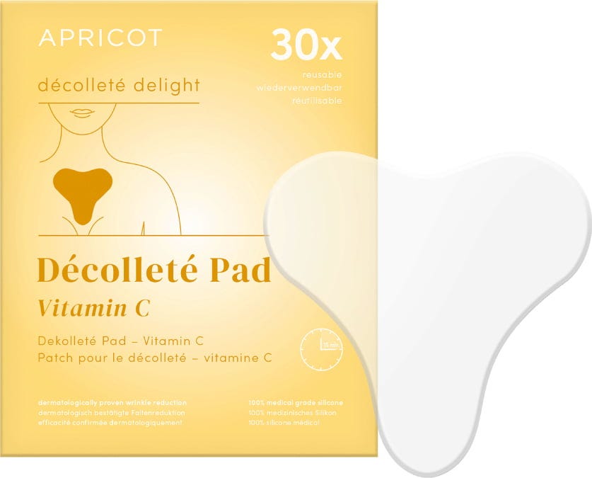 A compressa para decote com vitamina C da APRICOT proporciona cuidados intensivos para a pele hiperpigmentada ou danificada pelo sol na zona do decote. A almofada é feita de silicone de qualidade médica e é enriquecida com vitamina C antioxidante, que ajuda a suavizar as linhas e as rugas. Pode ser reutilizado até 30 vezes.