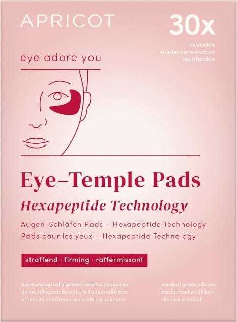 Os discos Hexapeptide Eye & Temple Pads da APRICOT nutrem, suavizam e refrescam a pele à volta dos olhos com um complexo de hexapeptídeos de alta qualidade. Os discos são fabricados em silicone de qualidade médica, são agradavelmente suaves e podem ser reutilizados até 30 vezes. São particularmente suaves para a pele, enquanto o complexo de hexapeptídeos pode fazer a sua magia. Ideal para uma utilização regular como parte da sua rotina de beleza.