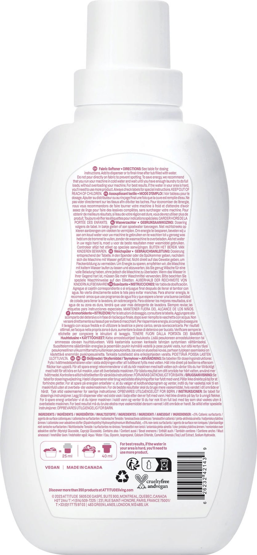 O amaciador natural para bebé da ATTITUDE é sem perfume e sem corantes, deixando a roupa macia e fofinha.