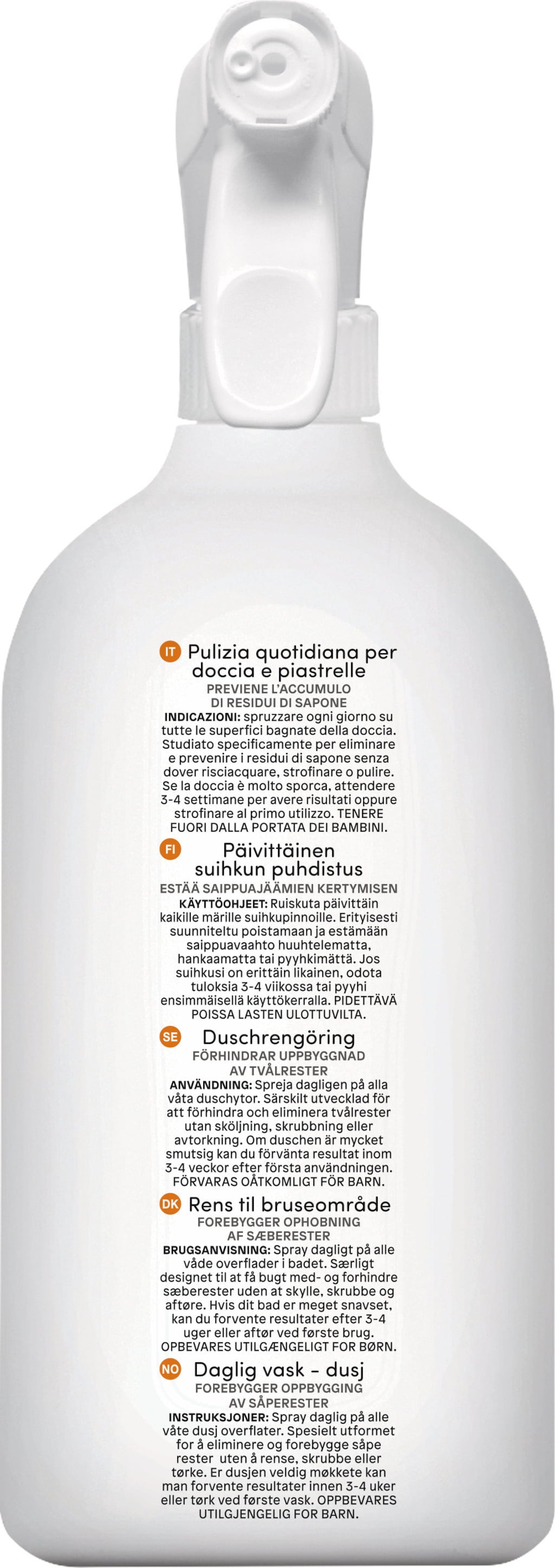 Modo de utilização: pulverizar diariamente sobre as superfícies húmidas do chuveiro e da casa de banho. Especialmente concebido para remover e prevenir resíduos de sabão, sem necessidade de enxaguar, esfregar ou passar com pano.