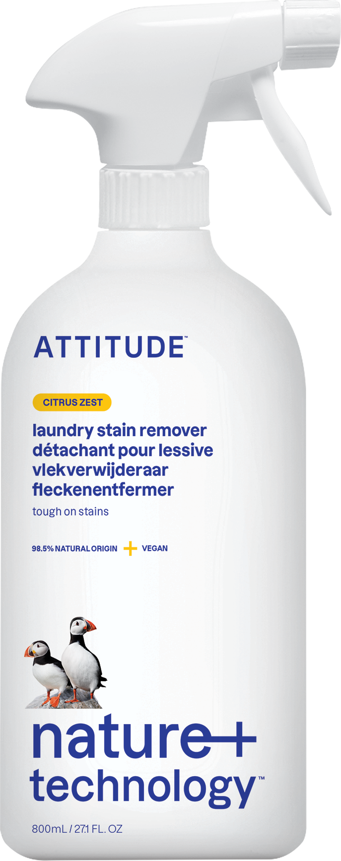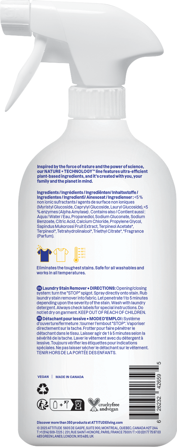 O removedor de nódoas da ATTITUDE combate nódoas persistentes na roupa de forma natural e eficiente, à base de plantas.