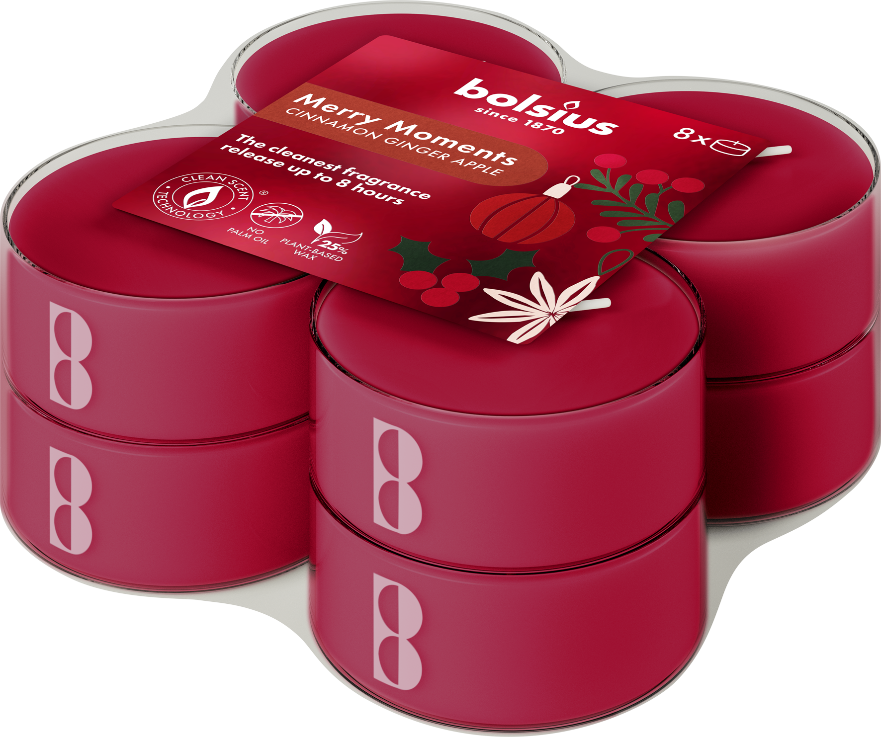 As tealights perfumadas Merry Moments da Bolsius encantam com a sua fragrância quente e especiada a canela, gengibre e maçã assada. O aroma permanece no ar durante muito tempo, proporcionando assim agradáveis momentos de bem-estar na estação fria. As velas são isentas de óleo de palma e enriquecidas com extratos naturais.