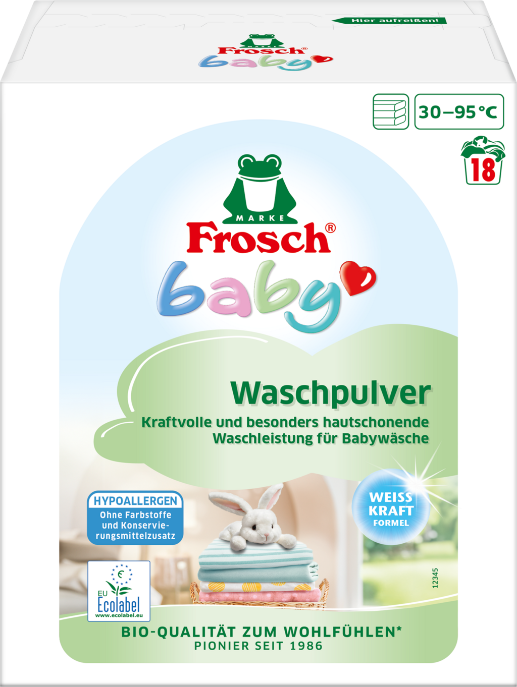 O Detergente em Pó para Bebé da Frosch é ideal para roupas brancas e roupas de lavar a altas temperaturas, podendo ser usado entre 30 °C e 95 °C. Possui um poder de lavagem elevado, removendo sujeiras de todos os tipos rapidamente.