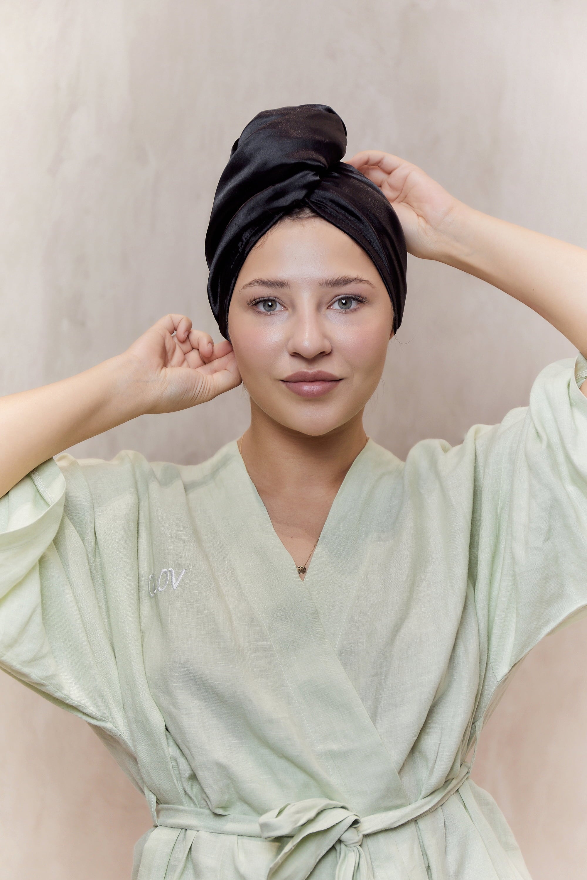 O turbante reversível pode ser usado de ambos os lados. A microfibra GLOV® superabsorvente retém a humidade após a lavagem do cabelo, enquanto o lado em cetim garante um visual elegante. Quando usado com o lado em cetim voltado para dentro, ajuda a evitar a quebra do cabelo, o frizz e os nós. O Hair Wrap é ideal para cabelo encaracolado ou para quem gosta de sair de casa com o cabelo ainda húmido – servindo também como um acessório sofisticado.
