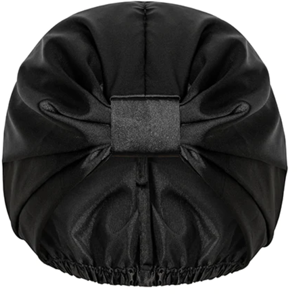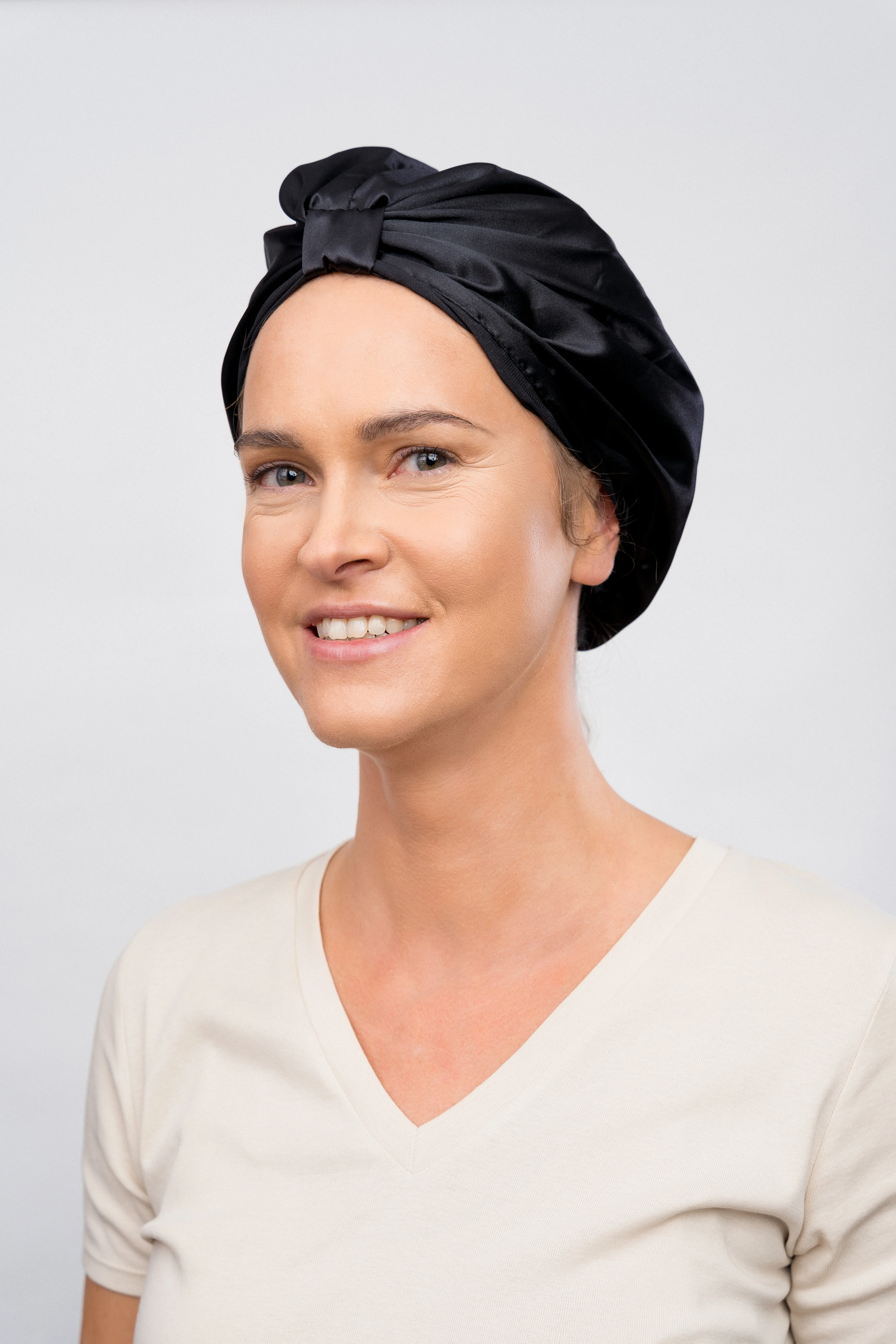 - Puxa depois a parte frontal do bonnet de cetim sobre o cabelo e certifica-te de que todas as madeixas ficam por baixo.