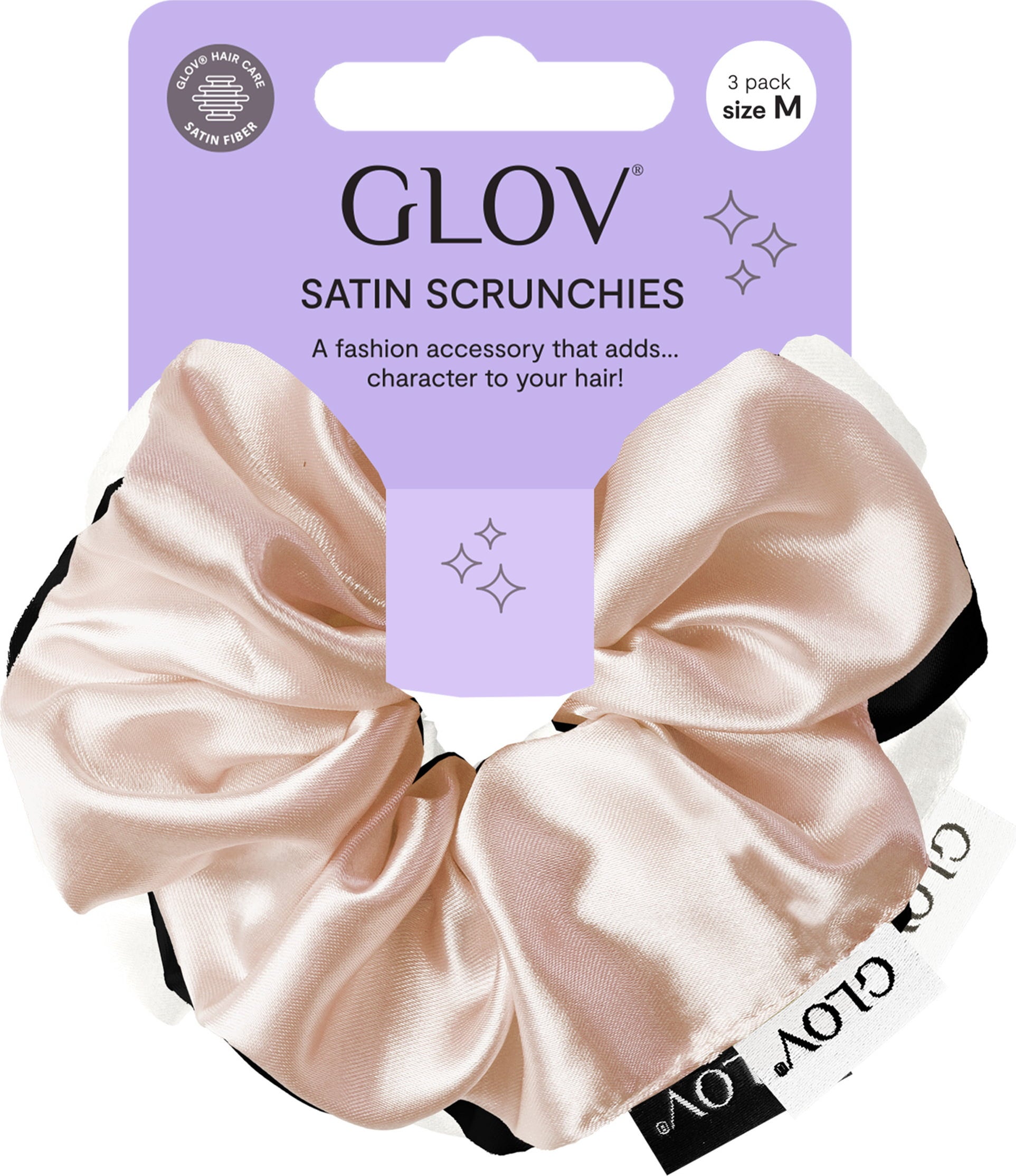 Este set contém três scrunchies em três cores diferentes e no tamanho médio. São feitos em cetim de poliéster, são suaves para o cabelo e valorizam o teu penteado.