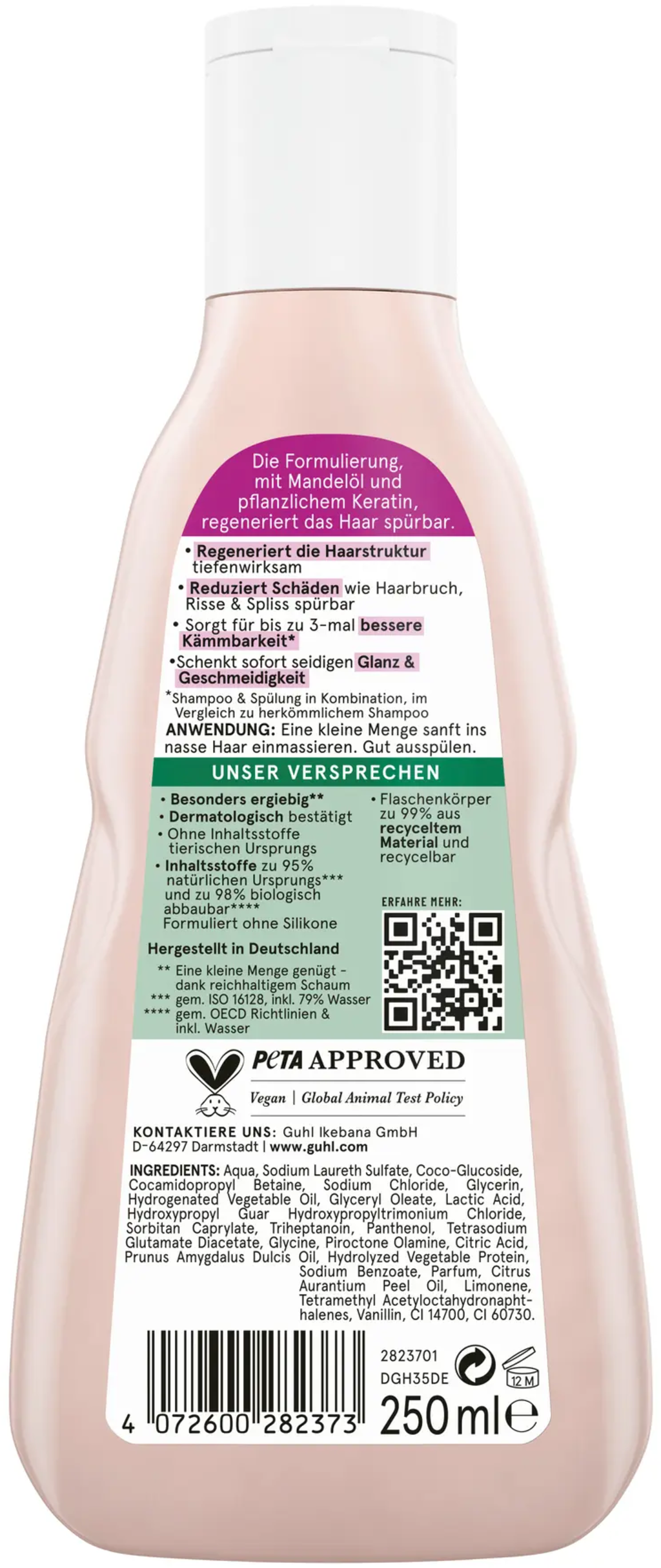 Aqua, Sodium Laureth Sulfate, Coco Glucoside, Cocamidopropyl Betaine, Sodium Chloride, Glycerin, Hydrogenated Vegetable Oil, Glyceryl Oleate, Lactic Acid, Hydroxypropyl Guar Hydroxypropyltrimonium Chloride, Sorbitan Caprylate, Triheptanoin, Panthenol, Tetrasodium Glutamate Diacetate, Glycine, Piroctone Olamine, Citric Acid, Prunus Amygdalus (Sweet Almond) Oil, Hydrolyzed Vegetable Protein, Sodium Benzoate, Parfum, Citrus Aurantium Peel Oil, Limonene, Tetramethyl Acetyloctahydronaphtalenes, Vanillin, CI 14700, CI 60730