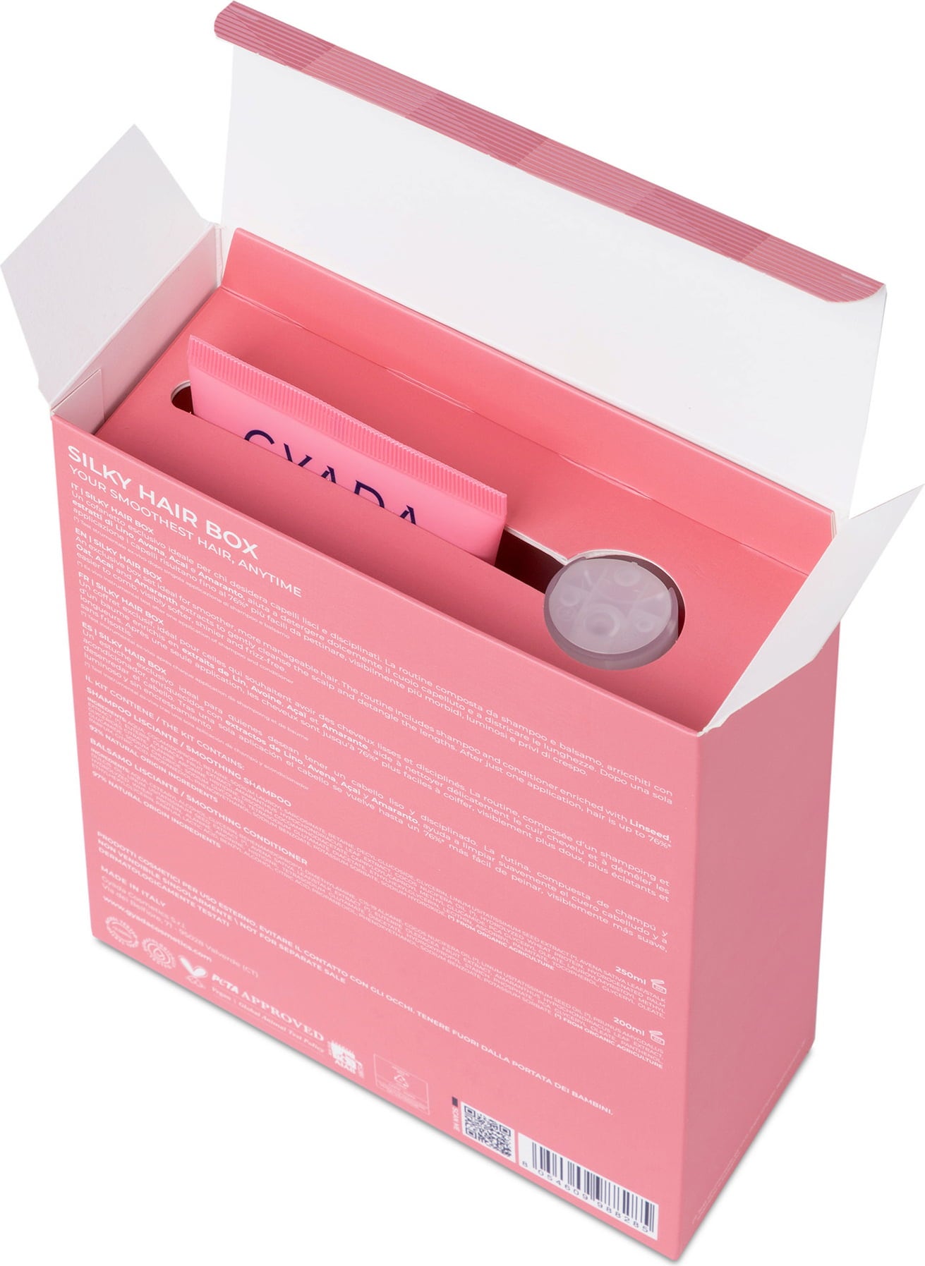 O Silky Hair Box contém dois produtos de cuidado do cabelo especialmente formulados para os cabelos lisos. O duo champô e amaciador é enriquecido com extractos de linho, aveia, açaí e amaranto, limpa suavemente o couro cabeludo e desembaraça o cabelo. Garante uma penteabilidade e um brilho agradáveis.