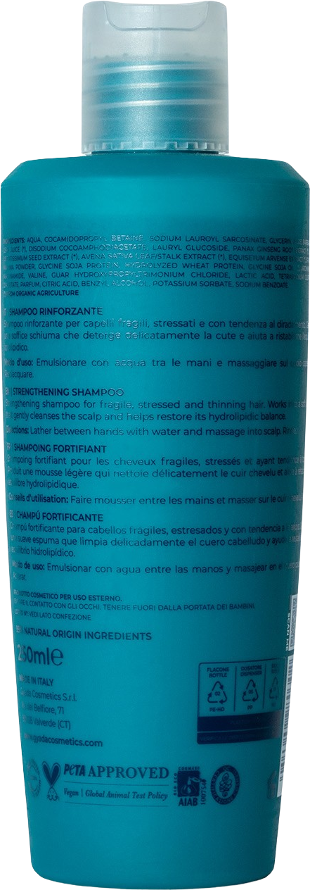O Champô Fortificante da GYADA devolve vitalidade ao cabelo danificado, fragilizado e com tendência a enfraquecer. É um produto concentrado que restaura o filme hidrolipídico do cabelo e do couro cabeludo, sendo igualmente adequado para couro cabeludo seco ou oleoso. Contém spirulina (algas marinhas ricas em vitaminas, aminoácidos e minerais), cavalinha, ginseng e aveia, com propriedades reestruturantes e estimulantes.