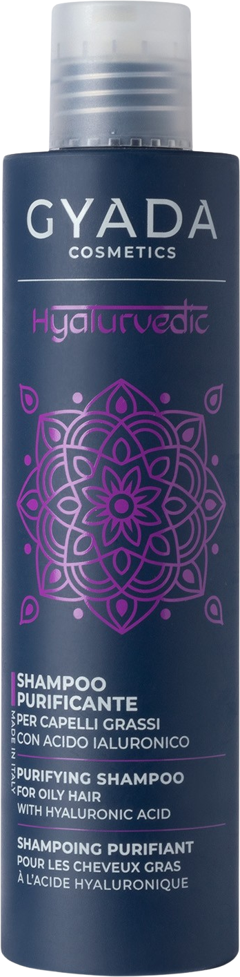 O champô purificante da linha Hyalurvedic da GYADA foi formulado com neem, moringa e cássia, sendo ideal para cabelo oleoso, fino e danificado. O neem é conhecido pelas suas propriedades purificantes e seborreguladoras, enquanto a moringa ajuda a equilibrar o couro cabeludo. Além disso, a fórmula contém extrato suavizante de pimenta chinesa e cássia fortalecedora. Esta combinação de ervas ayurvédicas é complementada por um complexo de ácido hialurónico que hidrata profundamente o cabelo, proporcionando-lhe proteção.