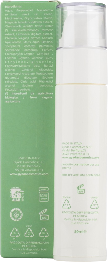 Aqua, Propandiol, Macadamia Ternifolia Seed Oil, Caolin Clay, Niacinamide, Oryza Sativa (Rice) Starch, Magnolia Biondii Bud/Flower Extract, Chamomilla Recutita Flower Water[1], Pseudoalteromonas Ferment Extract, Laminaria Digitata Extract, Chlorella Vulgaris Extract, Sodium Hyaluronate, Maris Aqua (Sea Water), Betaine, Tocopherol (Vitamin E), Ascorbyl Palmitate (Vitamin C), Saccharide Isomerate, Parfum, CI 75810 (Chlorophyllin-Copper Complex), Lecithin, Glycerin, Xanthan Gum, Ethylhexylglycerin, Polyhydroxystearic Acid, Benzyl Alcohol, Cetearyl Glucoside, Polyglyceryl-4-Caprate, Tetrasodium Glutamate Diacetate, Sodium Salicylate, Citricacid, Phenylethanol, Sodium Benzoate, Potassium Sorbate