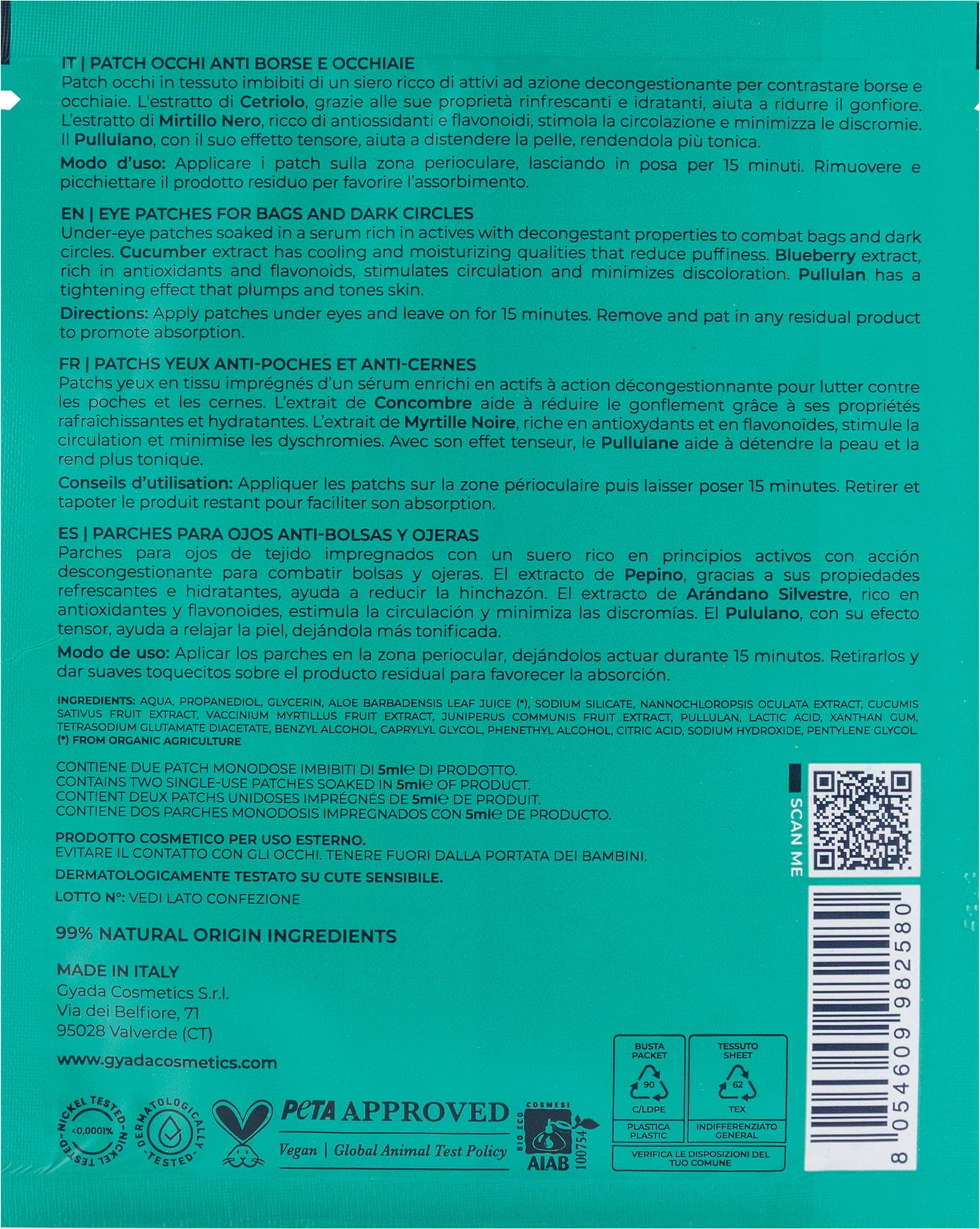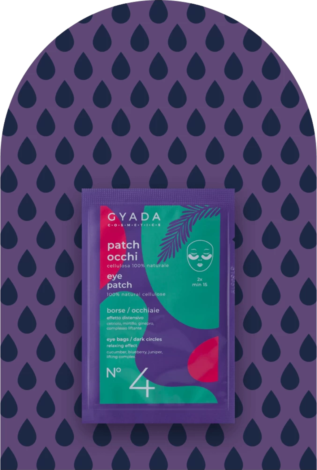 O patch para os olhos foi formulado com ingredientes como pepino, mirtilo, gengibre e um complexo lifting de origem vegetal, sendo ideal para aplicação em casos de olheiras. O tecido é feito de celulose vegetal.