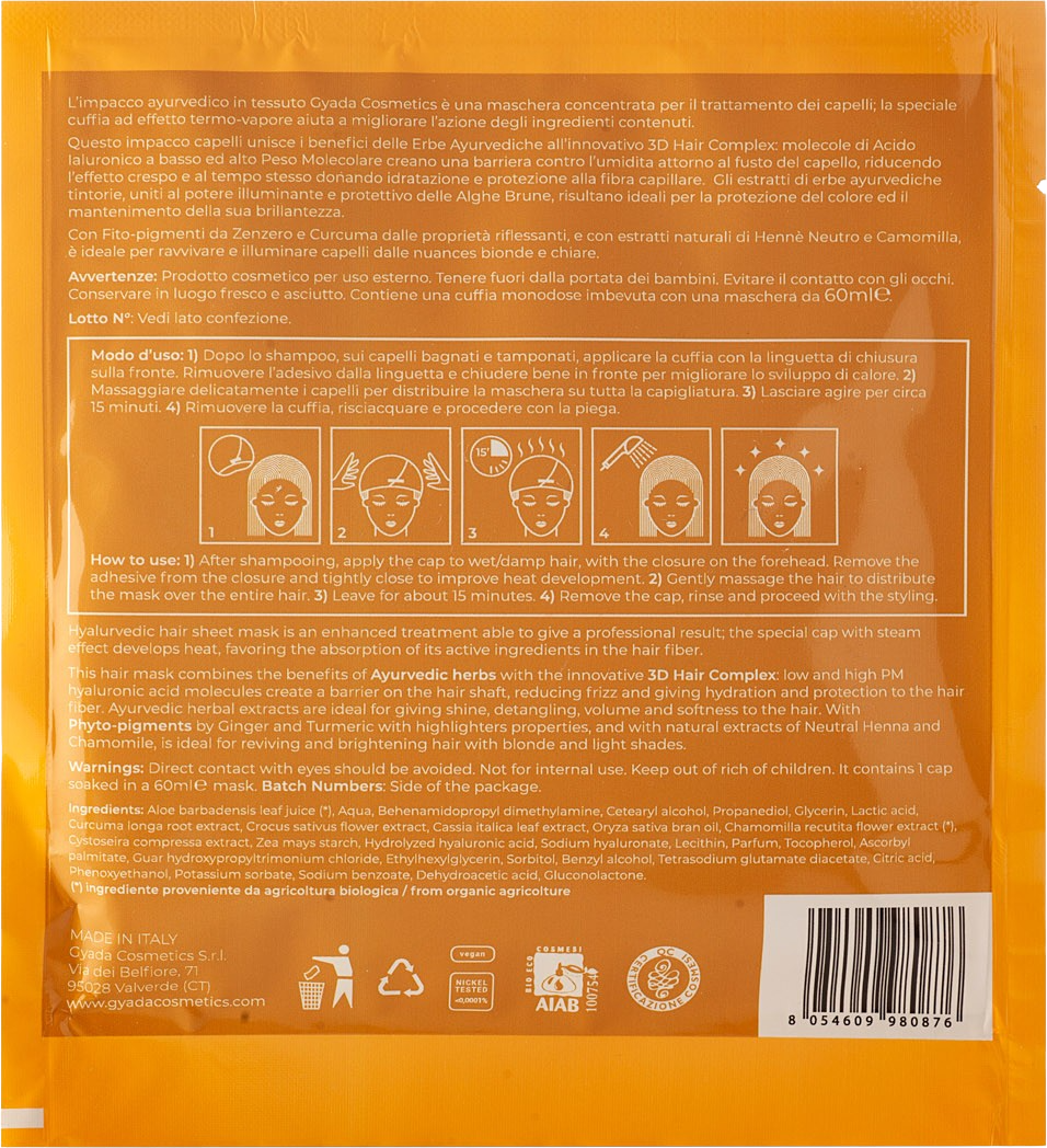 GYADA Cosmetics Máscara de Tecido Hyalurvedic para Brilho de Cor – Cabelos Dourados, 60 ml