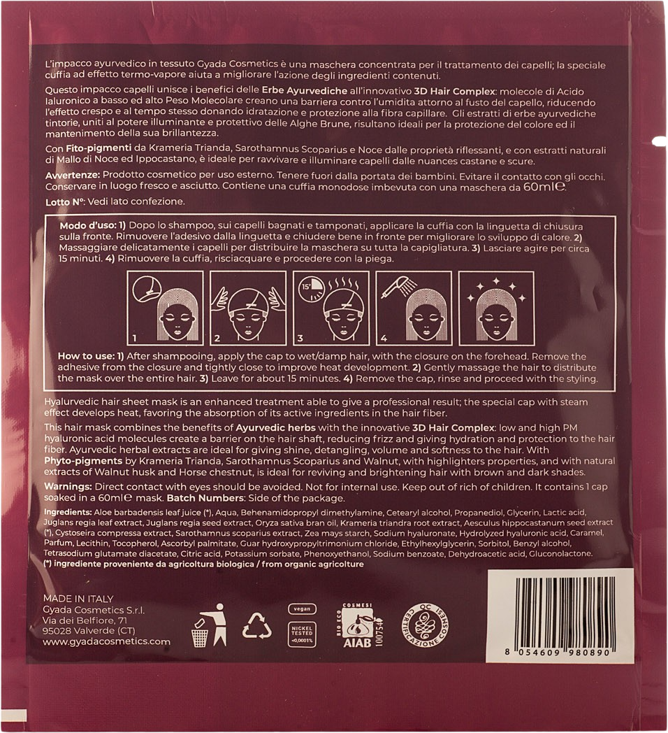 GYADA Cosmetics Máscara de Tecido Hyalurvedic para Brilho de Cor – Cabelos Escuros, 60 ml