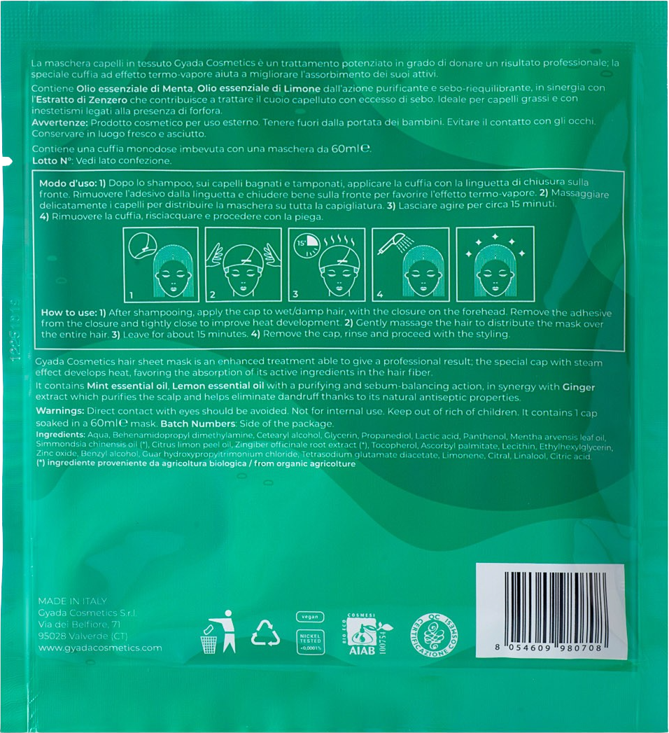 O efeito de calor desta máscara de pano especial favorece a absorção dos ingredientes ativos e proporciona um cuidado profissional. A sua formulação foi desenvolvida especialmente para cabelo oleoso e com caspa, purificando graças aos óleos essenciais de hortelã e limão. As propriedades seborreguladoras, reforçadas pelos extratos de gengibre, limpam o couro cabeludo e previnem naturalmente a formação de caspa.