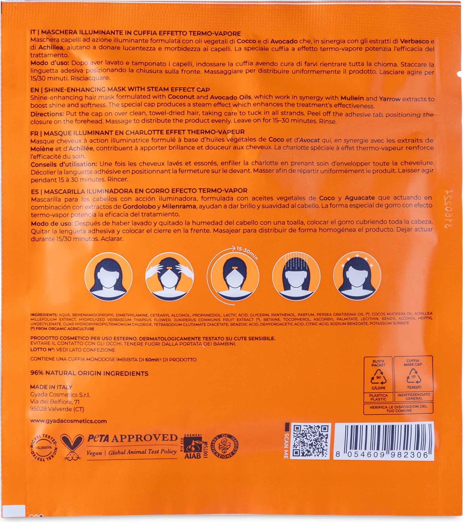 O cabelo danificado e sem vitalidade vai adorar o cuidado proporcionado pela máscara de pano revitalizante! O efeito de calor da touca permite que os princípios ativos penetrem melhor na fibra capilar, oferecendo assim um tratamento profissional. A fórmula contém óleos de coco e de abacate com propriedades nutritivas e regeneradoras, que em sinergia com extratos de cavalinha e pantenol protegem contra o stress oxidativo e conferem suavidade e brilho.