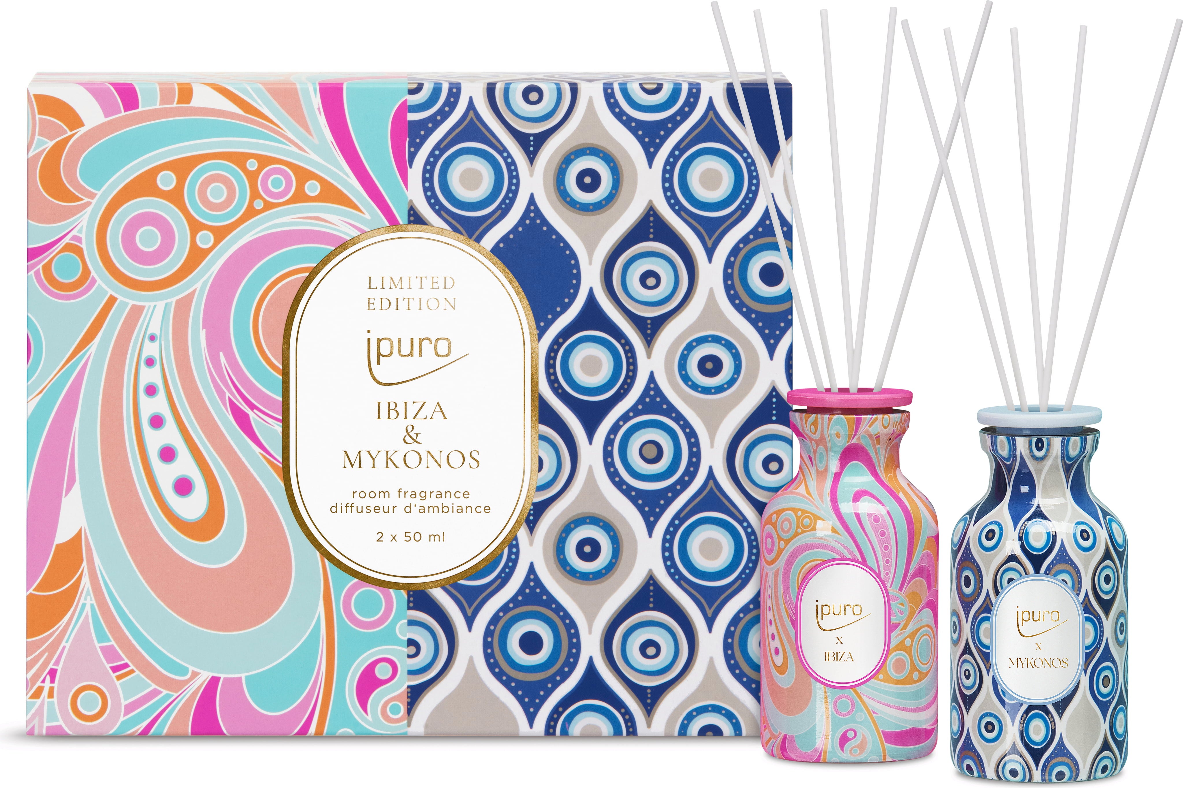 Este conjunto da ipuro contém as fragrâncias de ambiente Ibiza e Mykonos, 50 ml cada. Duas fragrâncias únicas e estivais que trazem uma frescura especial ao teu espaço.