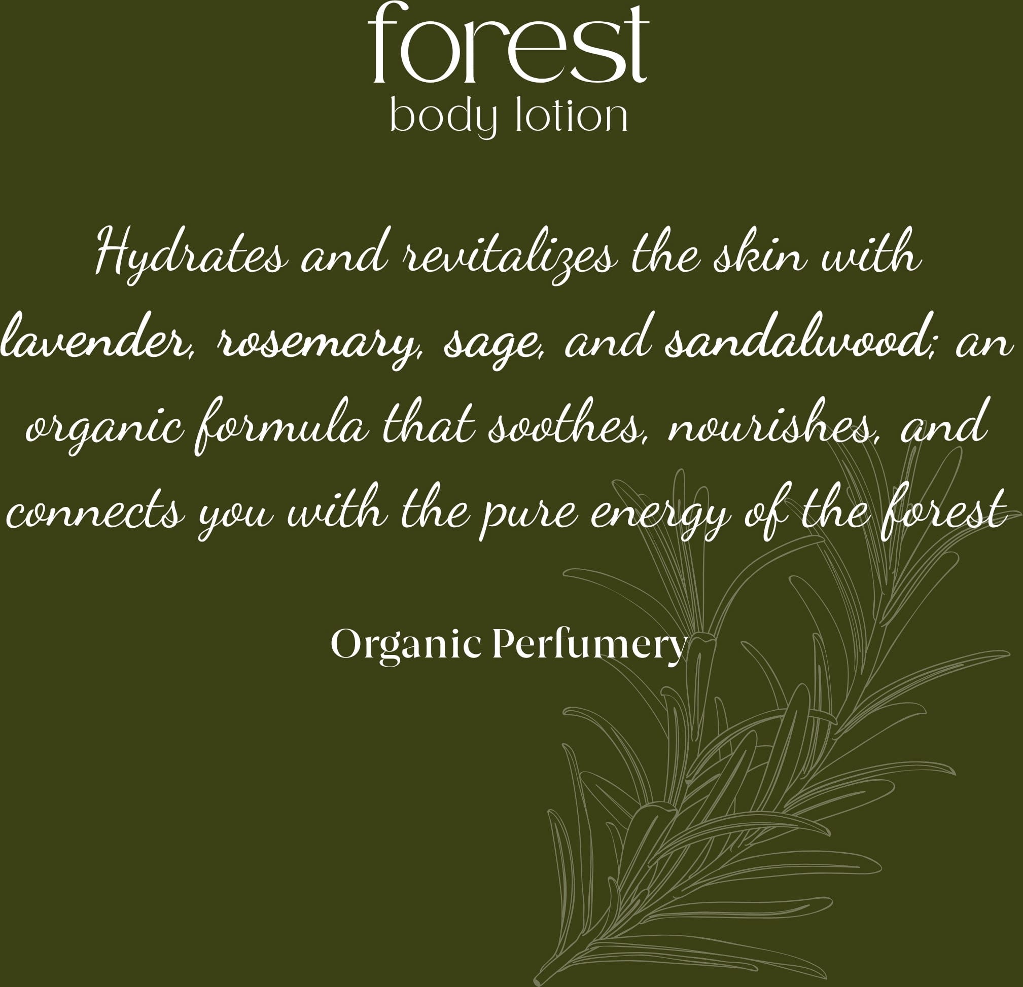 A fragrância perfumada Forest Biorganic Body Lotion oferece uma fragrância fresca e energizante, adequada para todos os tipos de pele. Integrada na tua rotina de beleza diária, envolve a pele numa fragrância fresca que simboliza presença, força e ligação à terra, como um passeio numa floresta mediterrânica.