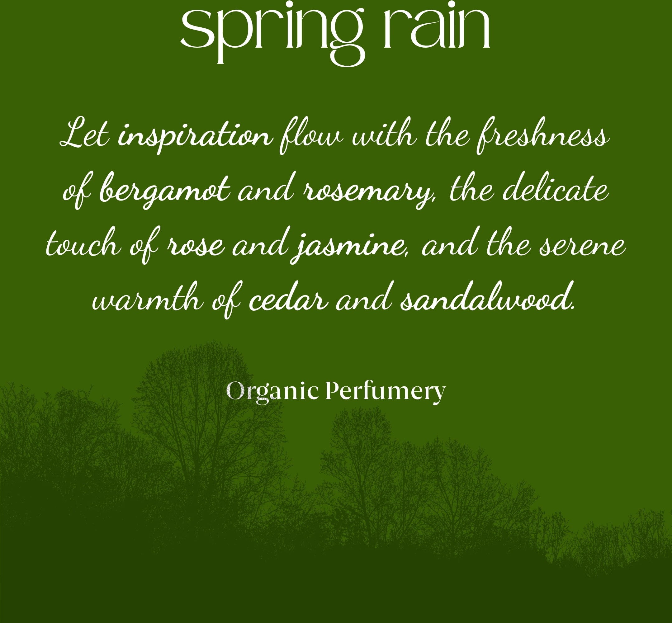 O perfume Spring Rain Organic Fresh Fragrance é a resposta à pergunta: Que perfume tem a chuva primaveril?. A sua composição oferece uma sensação fresca e floral que intensifica a ligação entre emoções, memórias e sentidos. A folha de hera biológica, macerada na água de colónia artesanal, confere à fragrância um toque ainda mais natural.