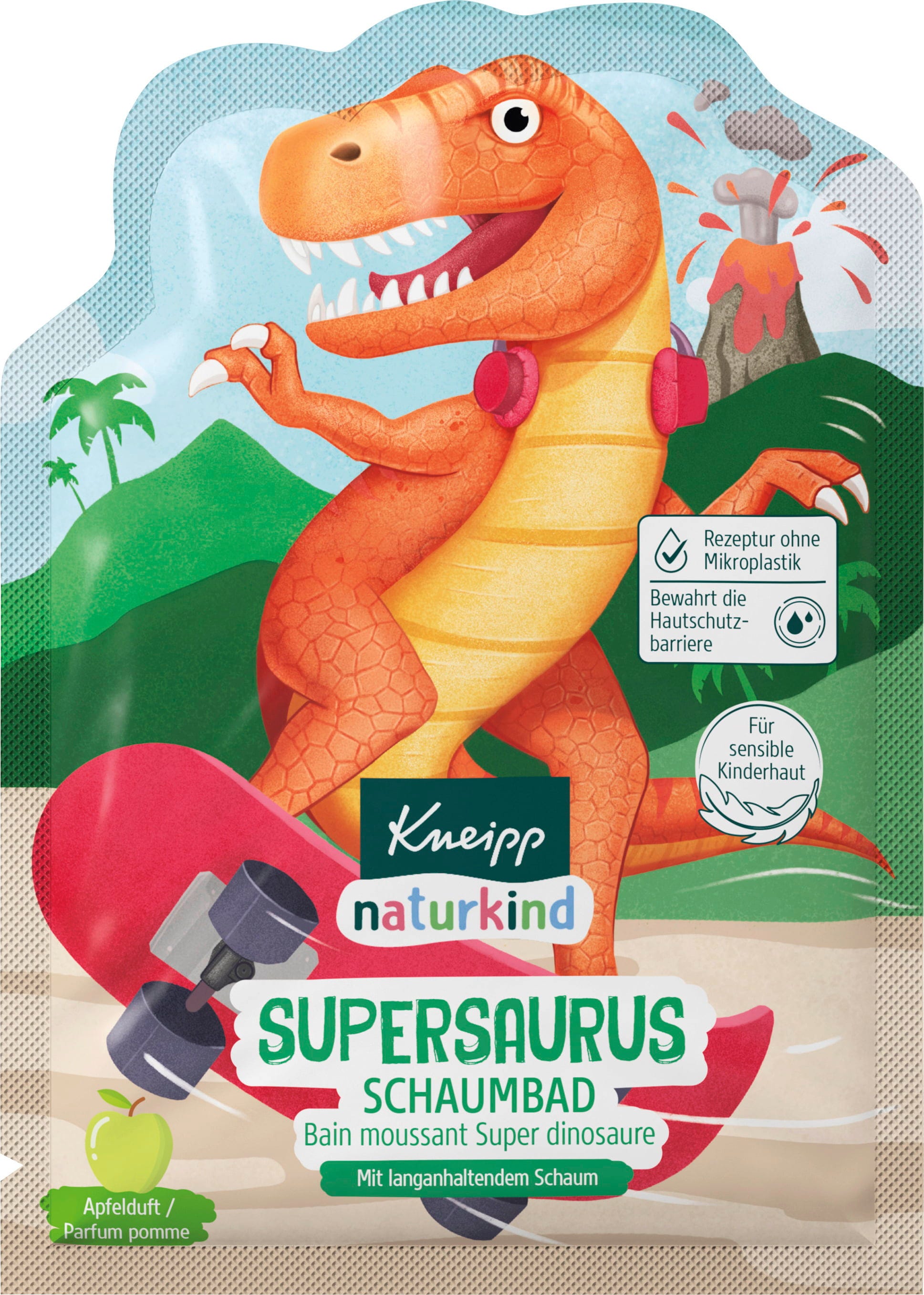 O banho de espuma Kneipp naturkind Supersaurus transforma a água do banho num mar de espuma fofa e convida-o a desfrutar de uma experiência de banho imaginativa. A fragrância frutada de maçã acompanha a diversão do banho e torna-o ainda mais excitante para os pequenos exploradores.