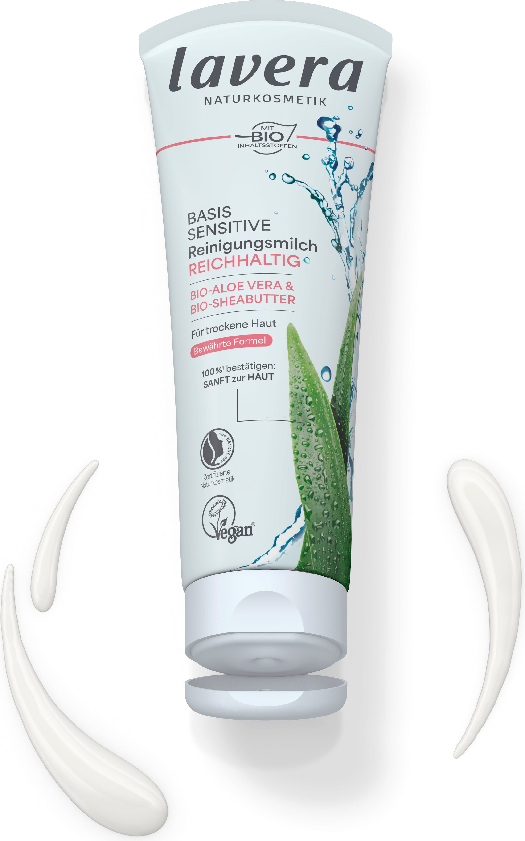 O leite de limpeza da lavera limpa suavemente até a pele seca e remove a maquilhagem dos olhos sem esforço. Os valiosos ingredientes do aloe vera hidratam o rosto e o tornam macio ao toque.
