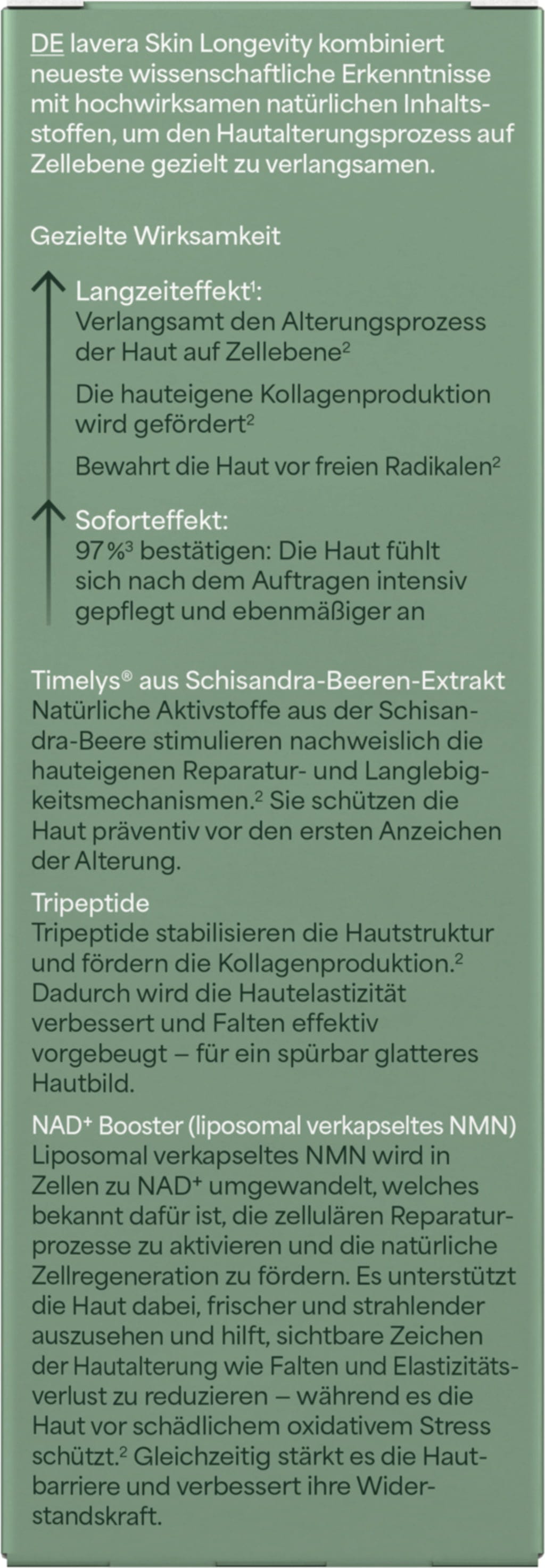 O Sérum Protetor Skin Longevity foi concebido como um cuidado complementar direcionado para retardar o processo de envelhecimento da pele ao nível celular. A sua formulação combina ingredientes inovadores, como um NAD+ Booster proveniente de NMN (nicotinamida mononucleótido) encapsulado em lipossomas, tripéptidos e o complexo TIMELYS® à base de bagas de schisandra. Em sinergia, o sérum pode influenciar positivamente a síntese de colagénio da própria pele e protegê-la contra radicais livres. Desta forma, contribui para prevenir os primeiros sinais de rugas – para uma pele uniforme e intensamente cuidada.