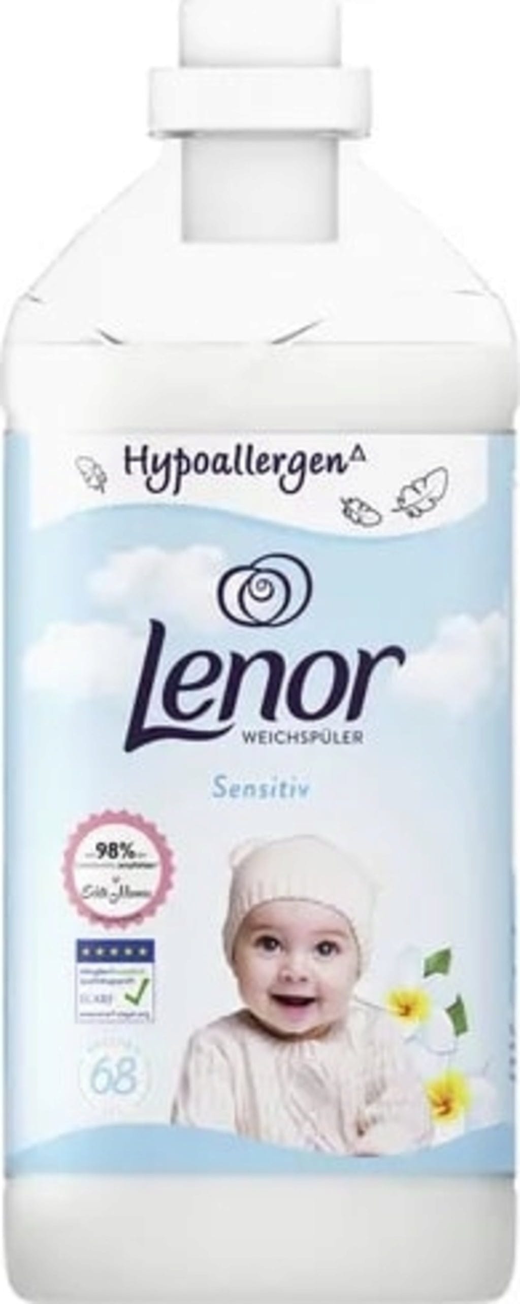 O amaciador Sensitive da Lenor caracteriza-se pela sua formulação hipoalergénica e é ideal para a lavagem de roupa de pessoas com pele sensível.