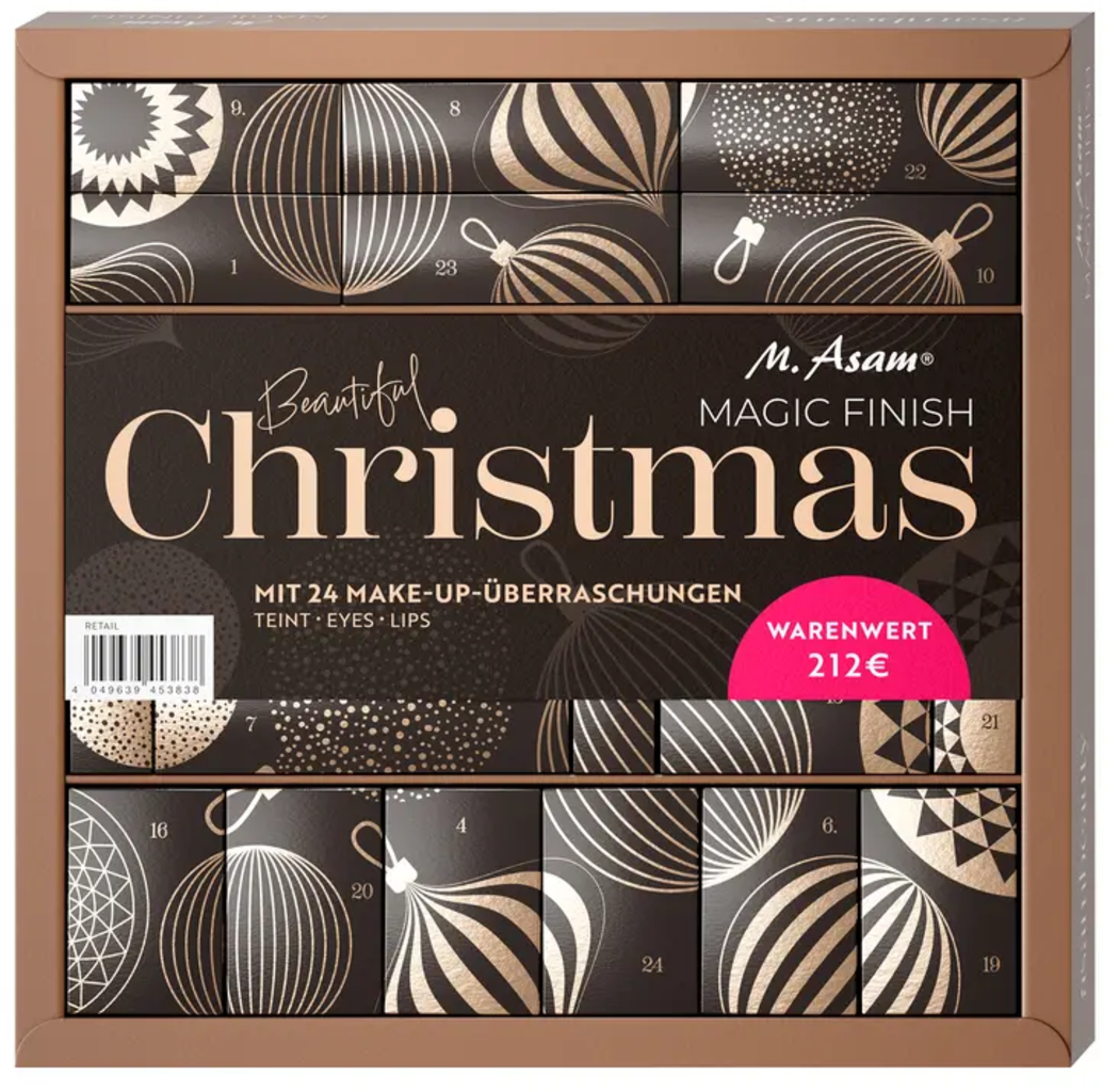 Aqui esperam-te 24 surpresas de beleza exclusivas da M.Asam! Desde clássicos populares até destaques cheios de brilho – a seleção de produtos, no valor de 212 €, oferece-te pequenas alegrias dia após dia durante o período que antecede o Natal. Com estes produtos, conseguirás criar tanto looks subtis como glamorosos.