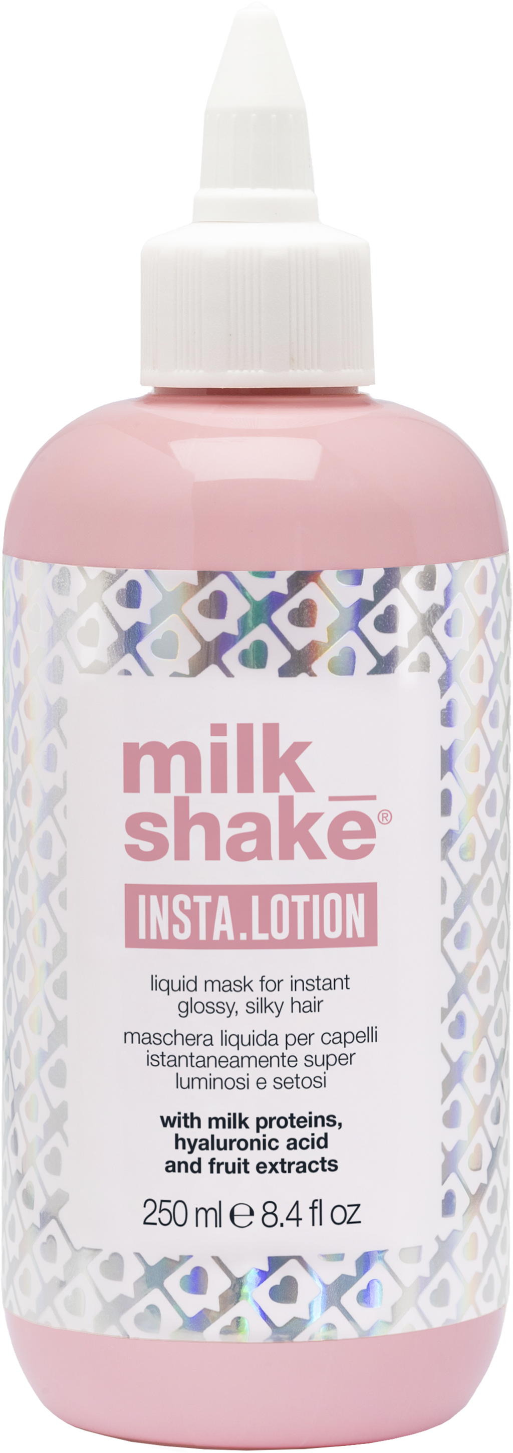 A Insta Lotion da milk_shake possui uma textura líquida, enriquecida com ácido hialurónico, proteínas do leite e extratos de frutas. Como máscara capilar de cuidado intensivo, garante um cabelo imediatamente desembaraçado e intensamente hidratado.