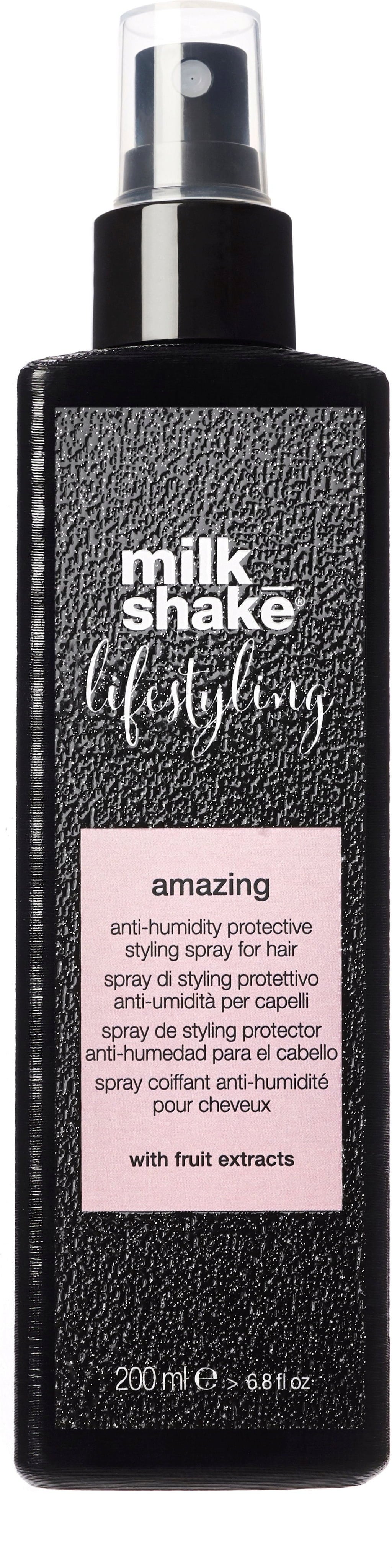 O Lifestyling Amazing da milk_shake é um spray pré-styling que protege o cabelo da humidade e dos danos causados pelo calor dos aparelhos de styling. Além disso, ajuda a minimizar o frizz, garantindo um resultado duradouro. Polímeros especiais, ativados pelo calor, formam uma película sobre o cabelo que o protege da humidade e preserva a cor. O spray reduz ainda o tempo de secagem e proporciona uma fixação duradoura, sem pesar o cabelo. A fórmula, enriquecida com extratos de frutas, confere um acabamento brilhante com efeito espelhado.