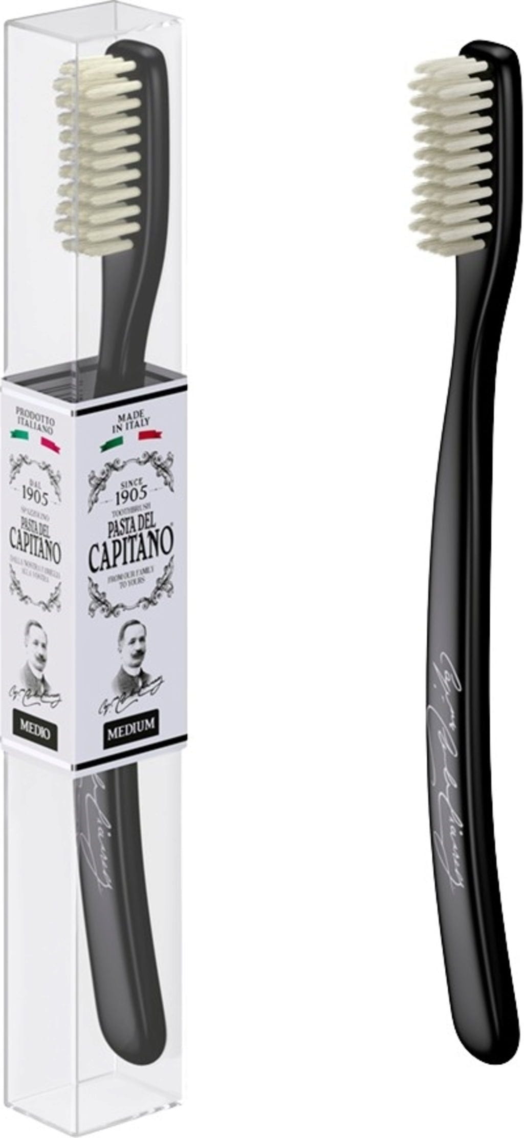 Esta elegante escova de dentes de Pasta del Capitano é uma réplica do modelo original e um must-have para todos os amantes do vintage. Graças às suas cerdas de dureza média, esta escova de dentes oferece uma limpeza eficaz e alcança também as zonas mais difíceis. A escova de dentes está disponível em várias cores.