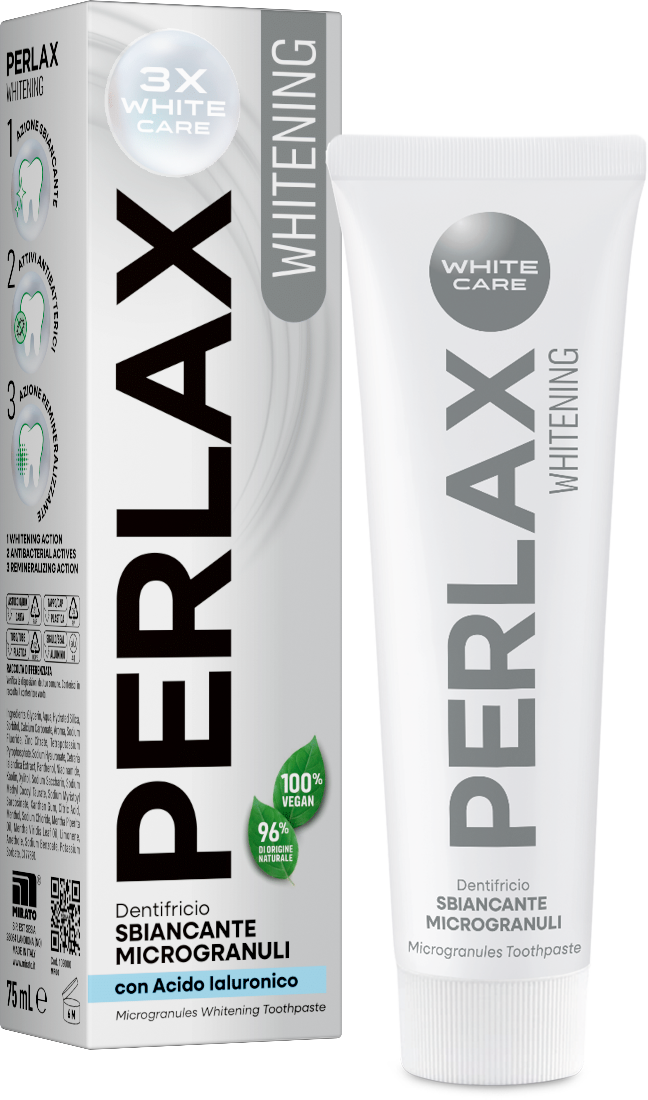 A pasta dentária Whitening Perlax é vegana e fornece um apoio ótimo para a tua rotina diária de cuidados dentários. Contém microgrânulos, argila branca e fluoreto de sódio, que removem suavemente a placa bacteriana e a descoloração superficial. O ácido hialurónico e as vitaminas B apoiam a hidratação das gengivas e também contribuem para o cuidado geral da tua cavidade oral.