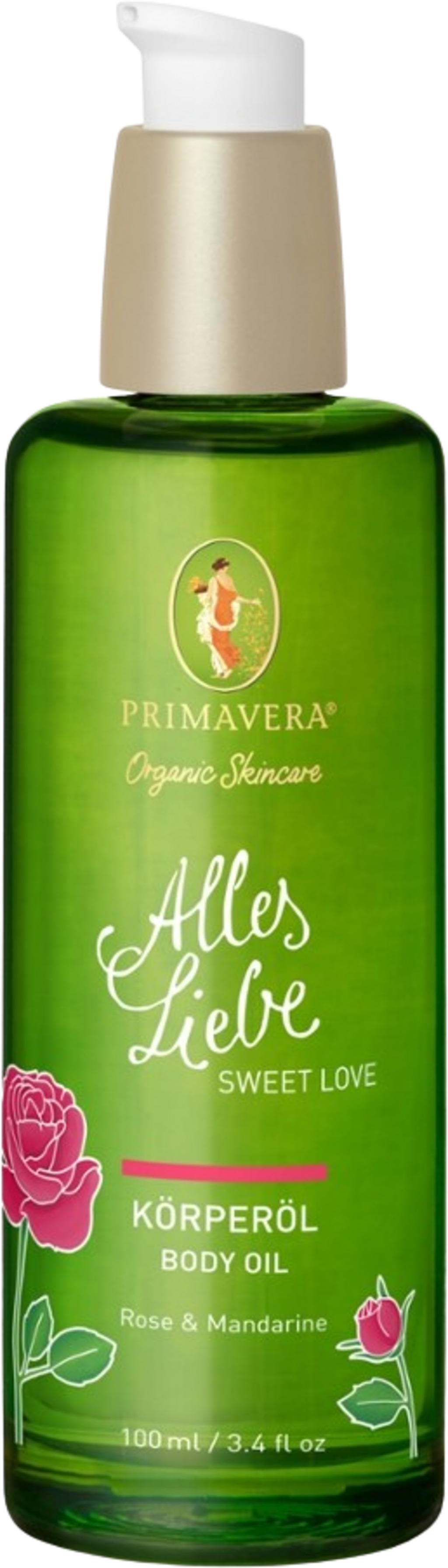 Este óleo corporal da linha Alles Liebe é composto por óleos vegetais orgânicos selecionados de amêndoas, jojoba e sésamo. Proporciona um cuidado intensivo, nutre e hidrata profundamente a pele. A sua fragrância de rosa e tangerina envolve o olfato de forma refrescante e sensual, enquanto o óleo confere uma sensação de pele macia e suave.