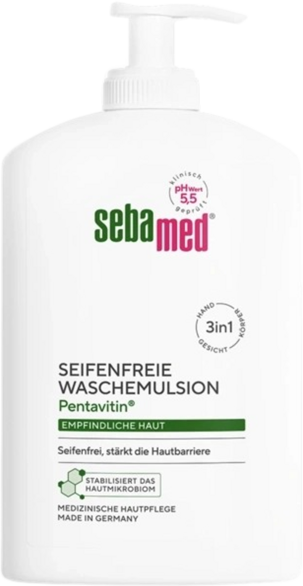 Substâncias de lavagem suaves na emulsão líquida Pentavitin® sem sabão da sebamed limpam a tua pele sensível de forma suave. A fórmula, sem sabão e sem microplástico, tem um pH de 5,5 e é adequada para a limpeza diária da pele. A emulsão de lavagem é enriquecida com alantoína, glicerina e pantenol.