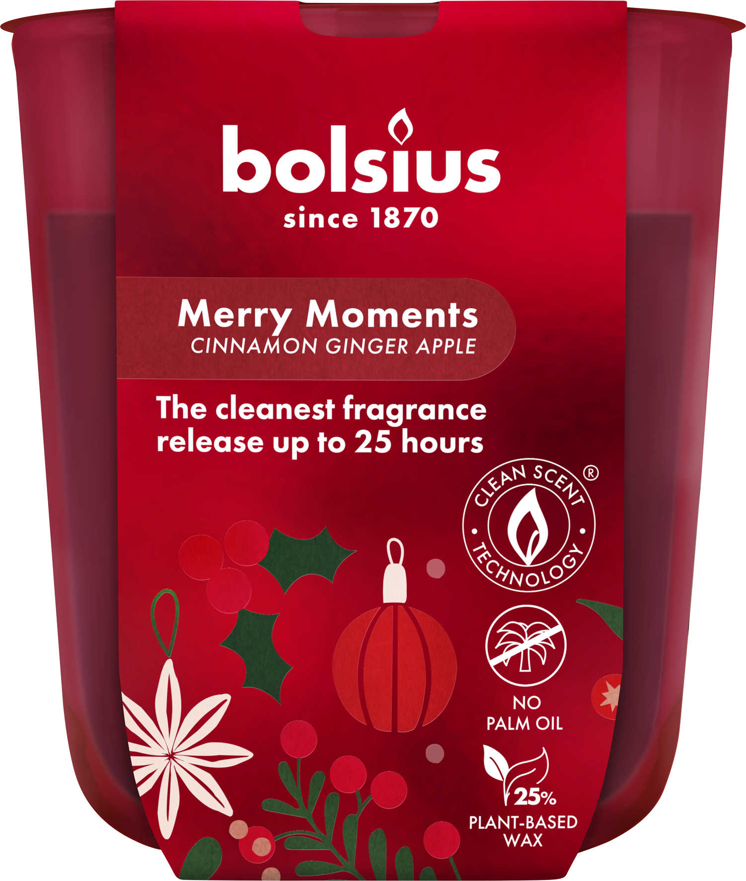 A vela perfumada Merry Moments da Bolsius encanta com o seu aroma quente e picante de canela, gengibre e maçã assada. As suas notas de fragrância invernal criam uma atmosfera duradoura e acolhedora no seu espaço de vida. A vela é isenta de óleo de palma e enriquecida com extractos naturais.