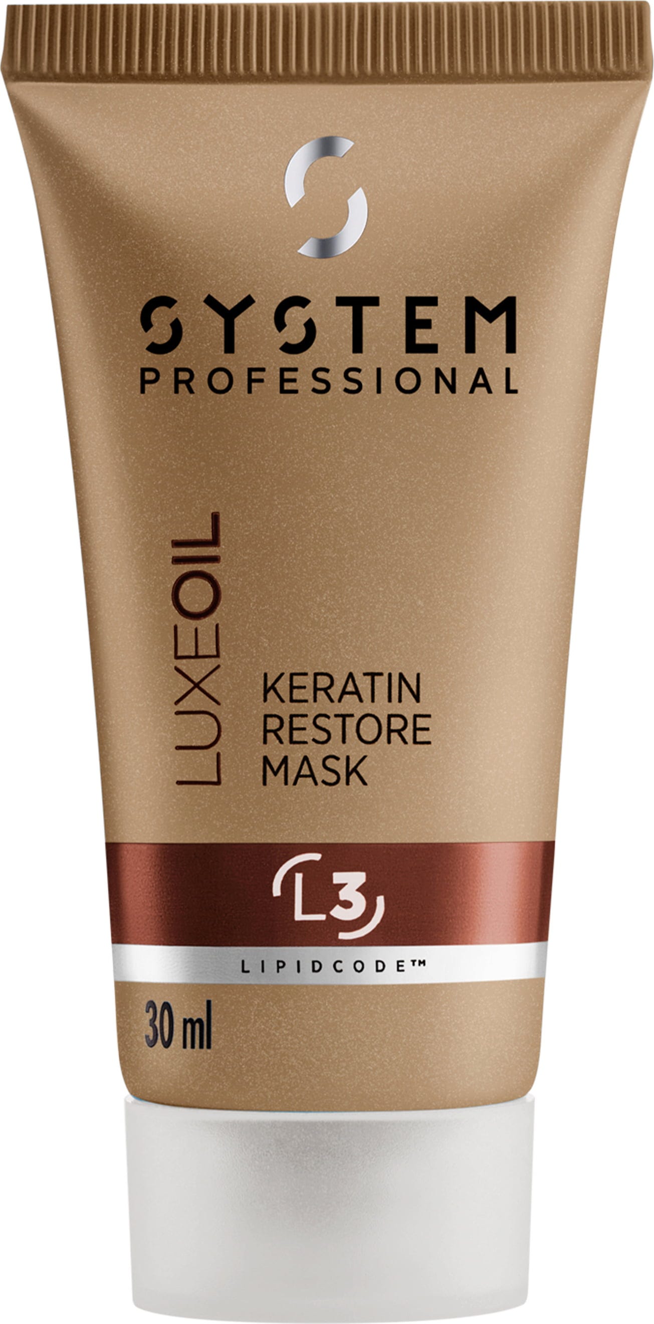 A LuxeOil Keratin Restore Mask (L3) da System Professional LipidCode restaura imediatamente o cabelo e protege a queratina e as fibras capilares do stress dos penteados.