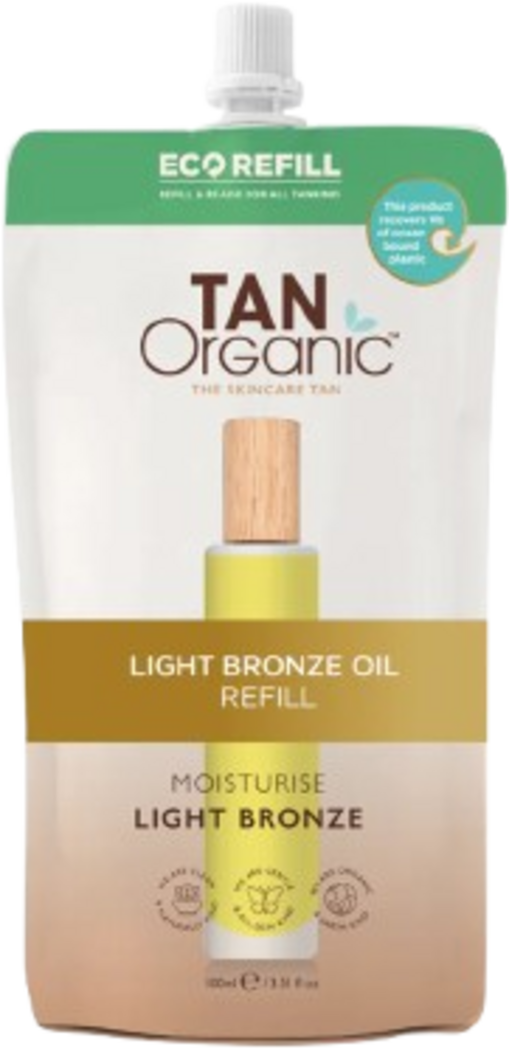 Cada bolsa de recarga Tan Organic contém dois frascos inteiros do seu óleo autobronzeador preferido. O revolucionário Self Tan Oil é um óleo leve e não oleoso que é rapidamente absorvido pela pele, hidrata intensamente e desenvolve uma tez naturalmente dourada após 6-8 horas, que dura até 7 dias. A fórmula com aloé vera biológico, óleo de argão, óleo de sementes de borragem e óleo de laranja doce deixa a pele aveludada e macia, confere-lhe uma luminosidade irresistível e garante um resultado homogéneo e sem riscos. Graças ao sistema de recarga, pode facilmente voltar a encher o seu frasco de vidro e reduzir os resíduos de plástico no processo. Isto não só torna o seu bronzeado mais bonito, como também mais sustentável.