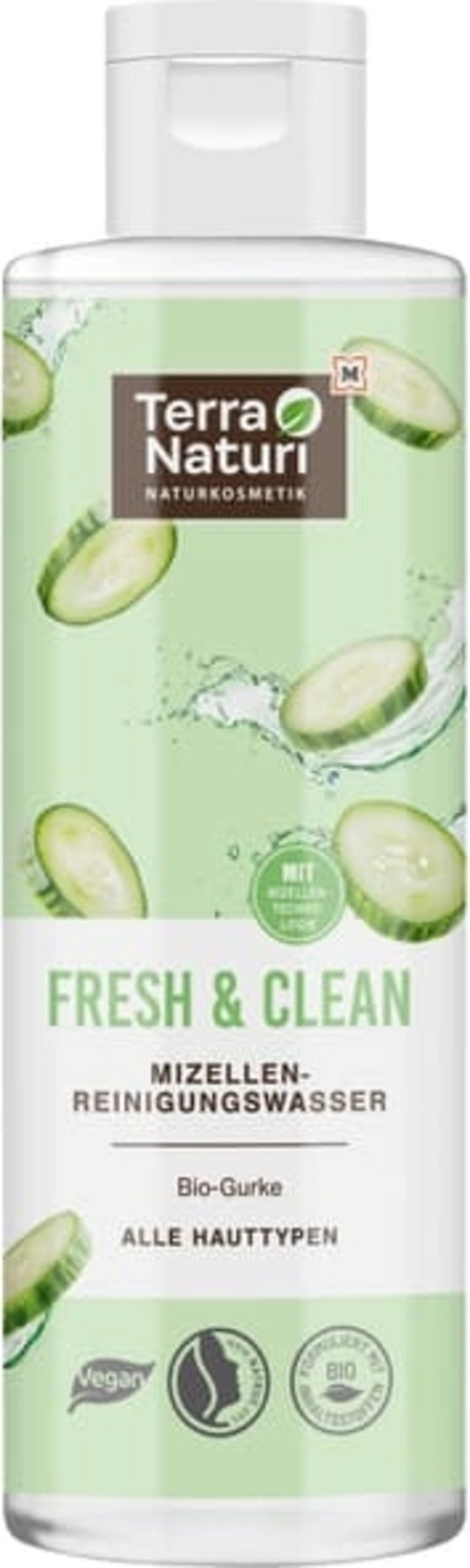 A água micelar de limpeza FRESH & CLEAN da Terra Naturi elimina suavemente a maquilhagem e a sujidade da pele do rosto. O extrato de pepino biológico e a betaína asseguram igualmente a nutrição e a hidratação da pele.