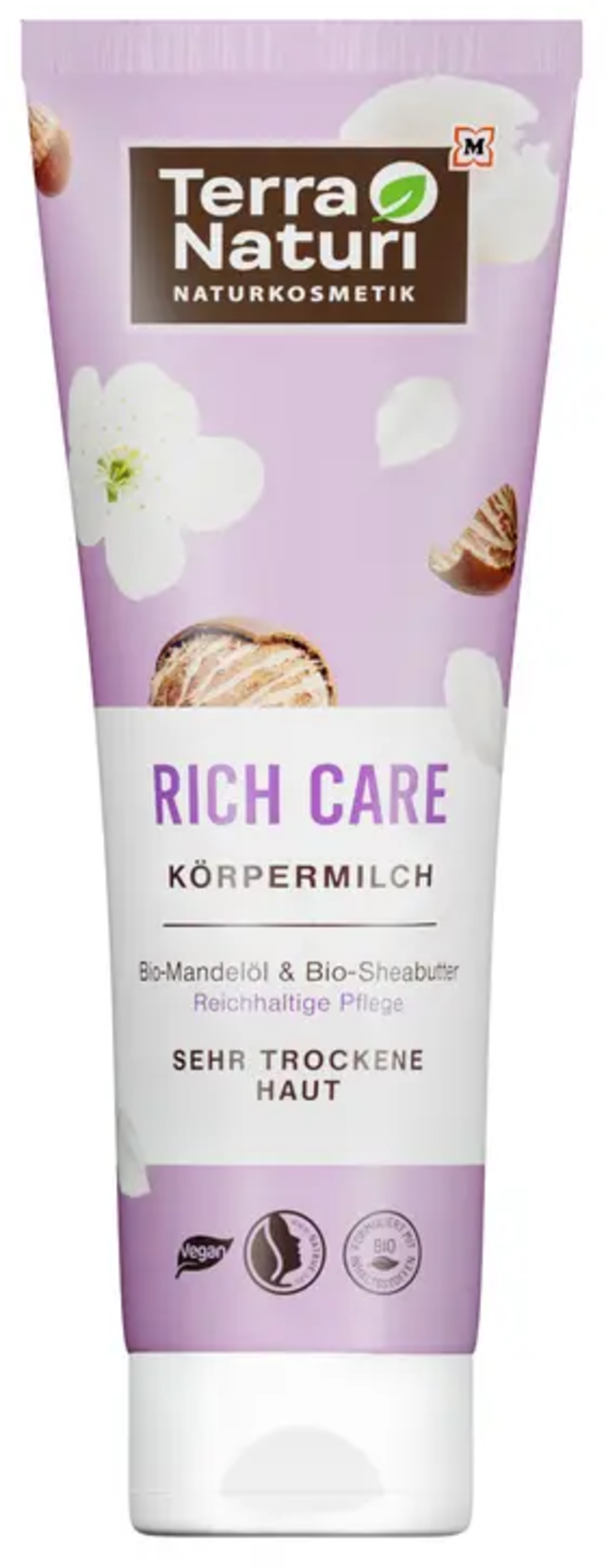 O Leite Corporal Manteira de Karité RICH CARE é um cuidado calmante para peles muito secas. A fórmula particularmente rica contém óleos vegetais orgânicos valiosos. Proporcionam à pele uma hidratação intensa e evitam que seque novamente rapidamente.