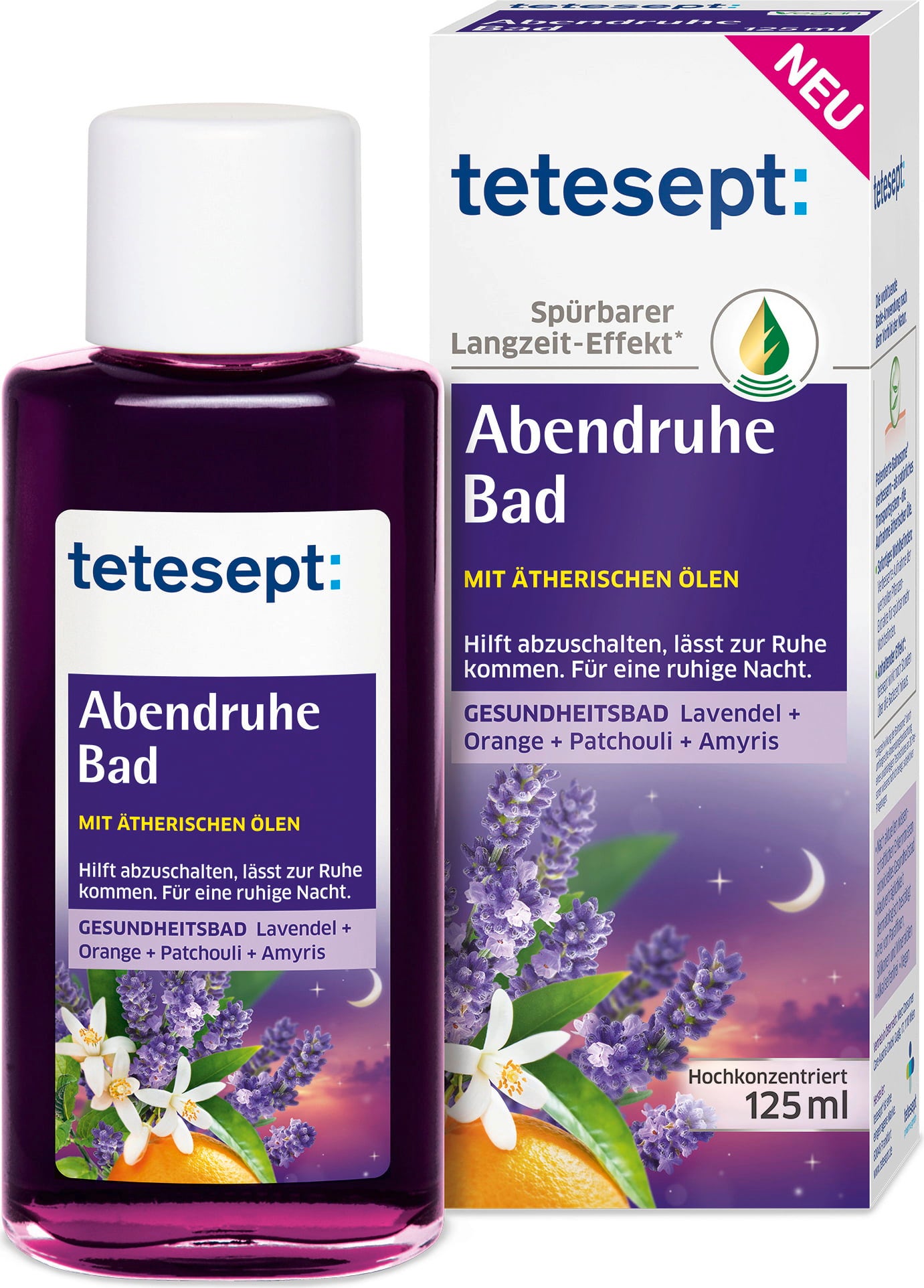 Um banho quente à noite dá-te a oportunidade de deixar para trás os acontecimentos do dia e preparar-te para a noite. O Concentrado de Banho Noite Tranquila da tetesept contém óleos essenciais naturais de lavanda, patchouli, laranja, gerânio-rosa e jasmim. É o complemento perfeito para o teu banho noturno e encanta com a sua formulação vegan!