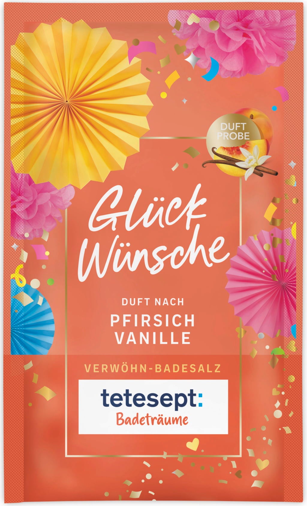O Sal de Banho Felicitações da tetesept completa o teu cabaz de presentes. Oferece aos teus entes queridos um conjunto de bem-estar – um aditivo de banho frutado e fresco não pode, naturalmente, faltar. O sal de banho exala uma fragrância maravilhosa de pêssego e baunilha, transformando assim o momento do banho numa experiência perfeita. Além disso, a formulação é livre de ingredientes de origem animal e, graças à sua fórmula de cuidado intensivo, é especialmente adequada para pele seca.