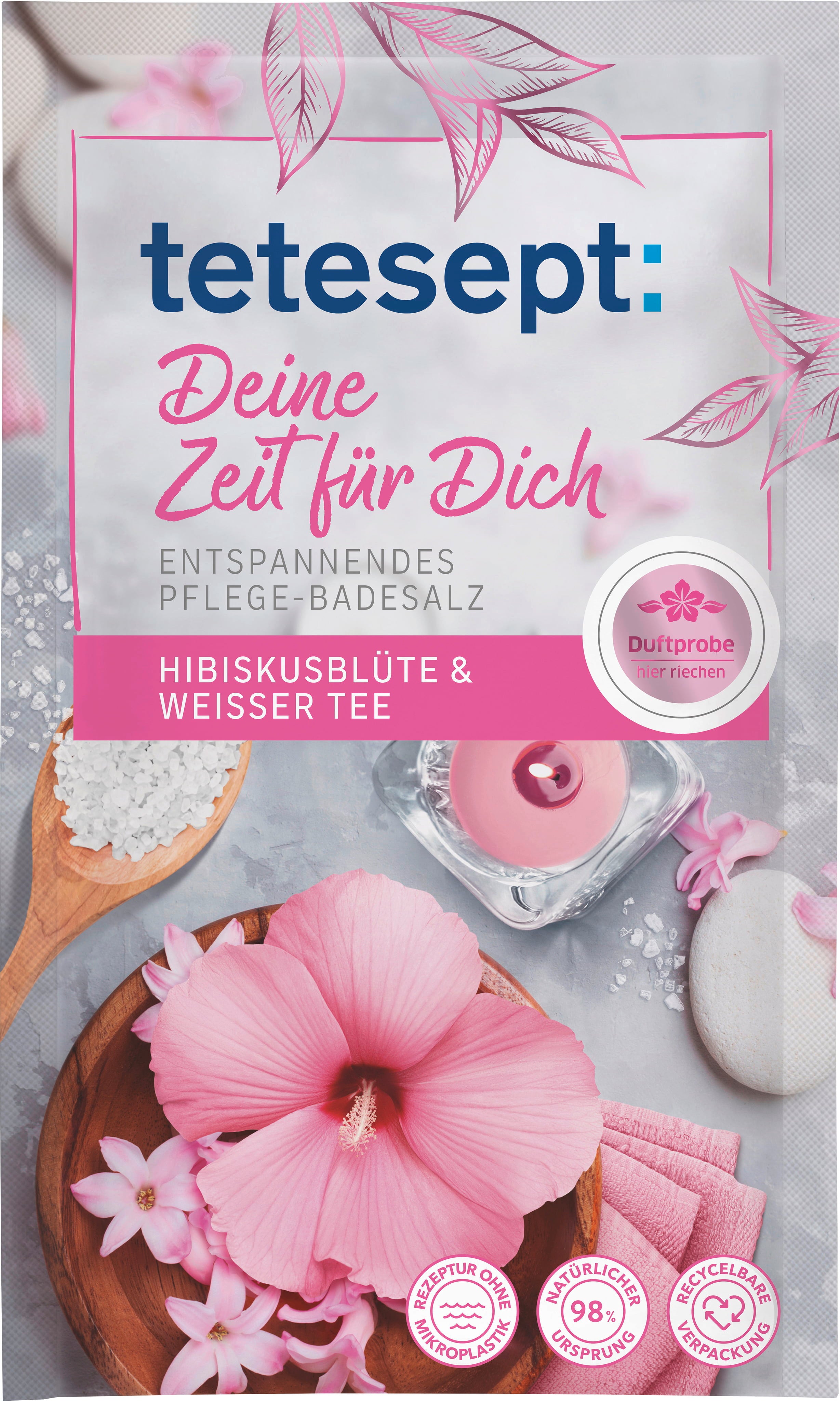 O Sal de Banho O Teu Momento para Ti da tetesept garante, graças à sua fórmula de cuidado intensivo, não só uma sensação maravilhosamente suave na pele, como também a oportunidade perfeita para escapar ao stress do dia a dia durante alguns minutos. A formulação com sal marinho puro é composta por 98 % de ingredientes de origem natural, além de ser vegan e livre de microplásticos. Deixa-te encantar pela fragrância floral de flor de hibisco e chá branco e desfruta da tua pausa!