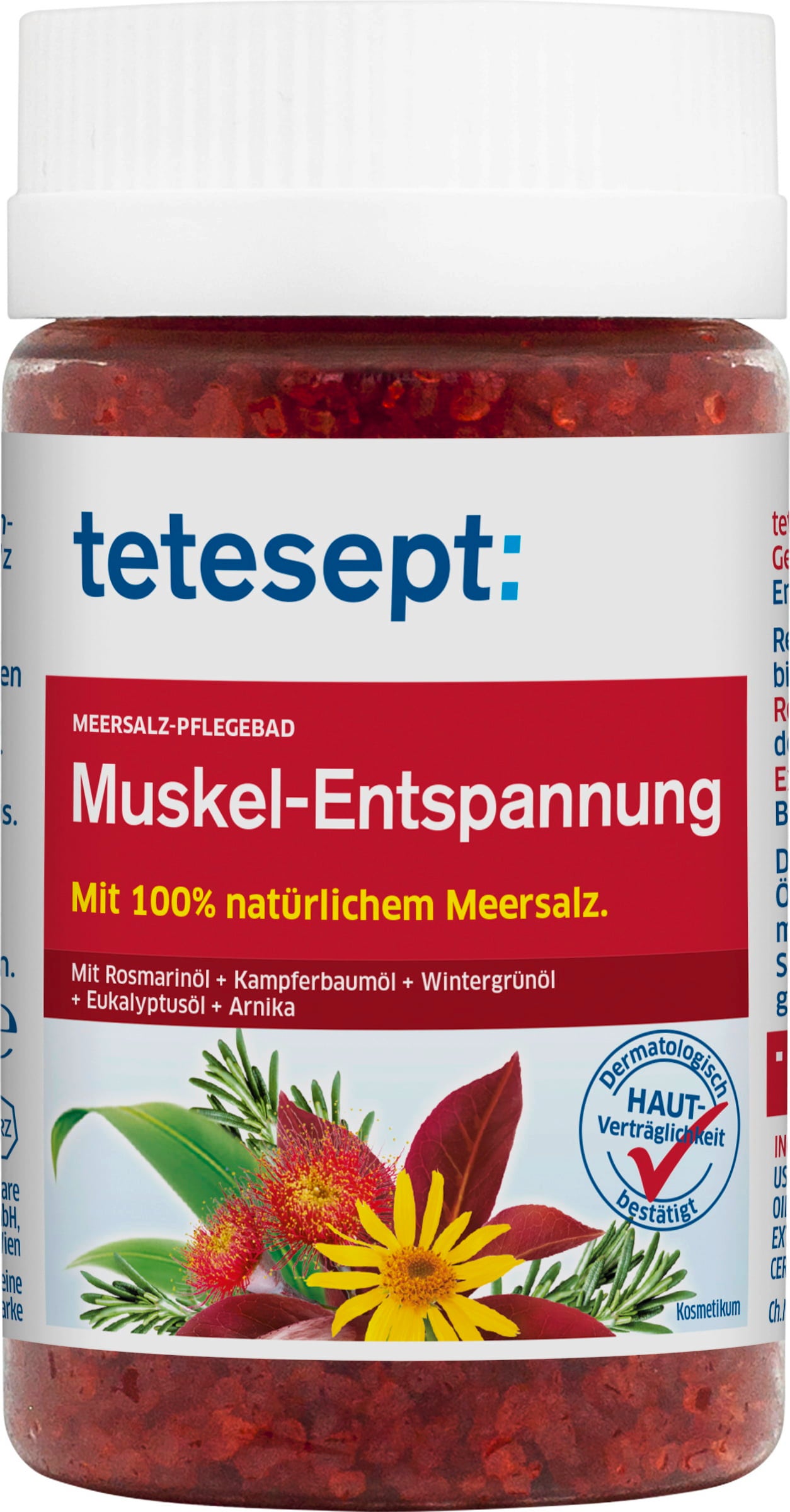 Deste tudo no desporto ou numa caminhada? Então dá ao teu corpo uma pausa e desfruta do Sal de Banho - Relaxamento Muscular da tetesept! Este sal de banho é composto por 100% de sal marinho puro natural e proporciona um cuidado valioso à pele. Óleos essenciais naturais de alecrim, cânfora, eucalipto e wintergreen, bem como extrato de arnica, oferecem uma fragrância maravilhosa e revelam as suas propriedades benéficas.