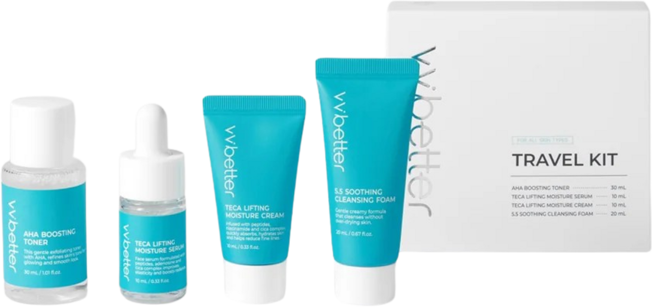 O Travel Kit Blue oferece o teu conjunto completo de minicuidados coreanos para uma pele radiante, onde quer que estejas. O set inclui limpeza, tónico, sérum e creme em práticos formatos de viagem, ideais para levar contigo, usar no ginásio ou para experimentar os populares produtos da VVBETTER.