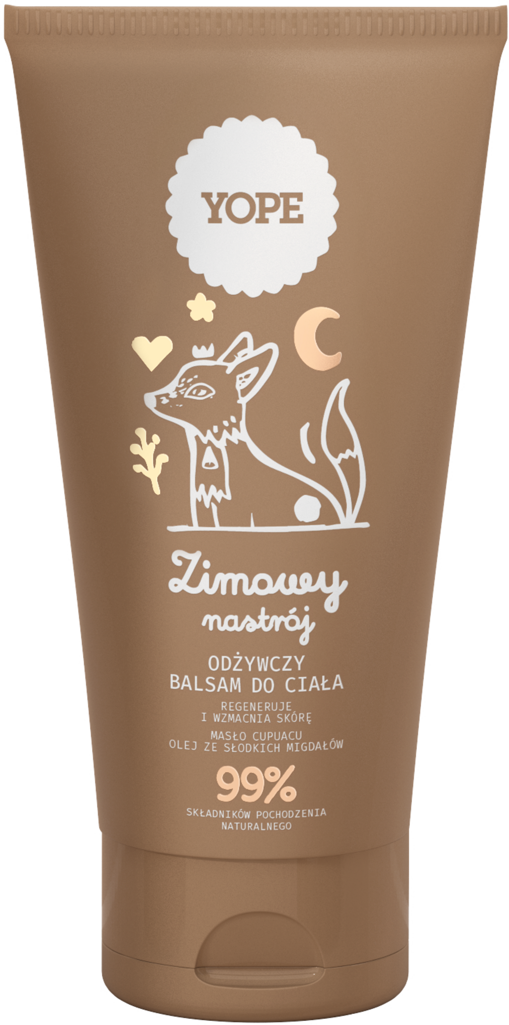 Cuidados agradáveis para a pele seca: A loção corporal Winter Mood da YOPE mima a pele com manteiga de cupuaçu, manteiga de karité, óleo de macadâmia, óleo de amêndoas doces e um aroma suavemente quente a madeira de cedro, âmbar e canela.